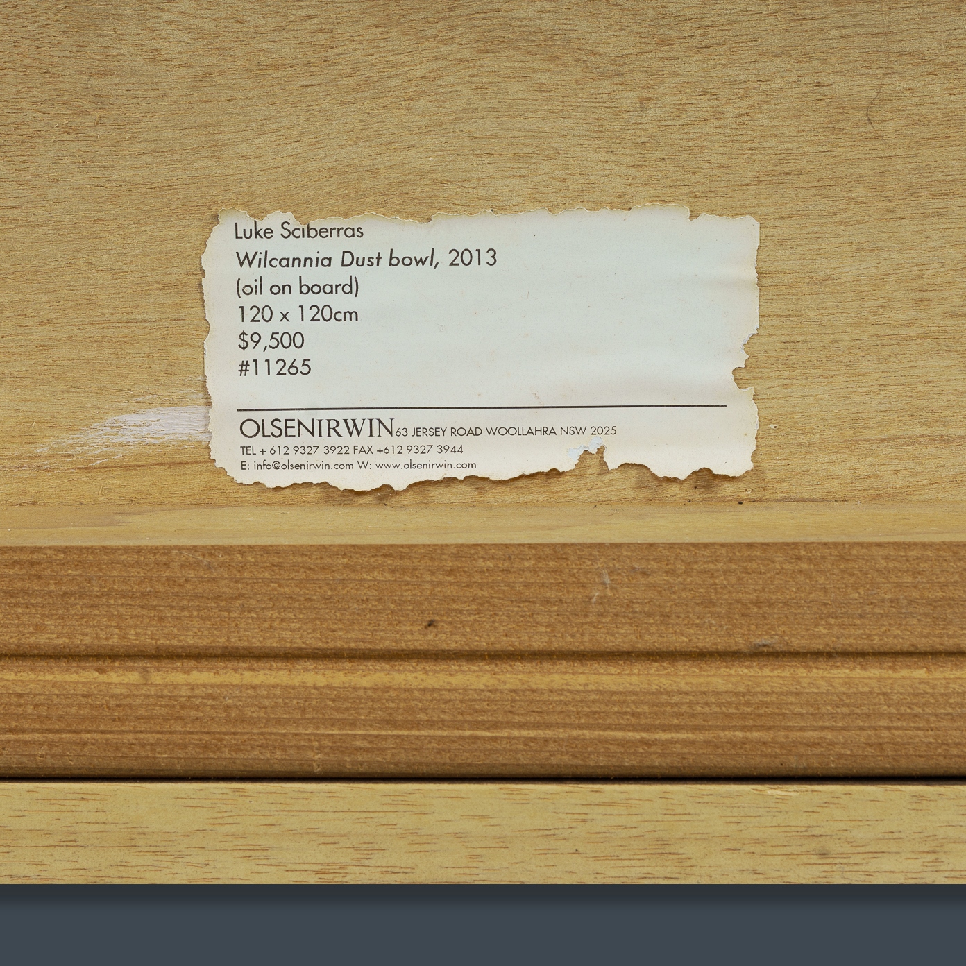 SCIBERRAS, Luke (b.1975) 'Wilcannia Dust Bowl,' 2013. Unsigned Ex Olsen Irwin Gallery, Sydney (label verso #11265) Oil on Board 120x120cmEstimate $6,000-8,000