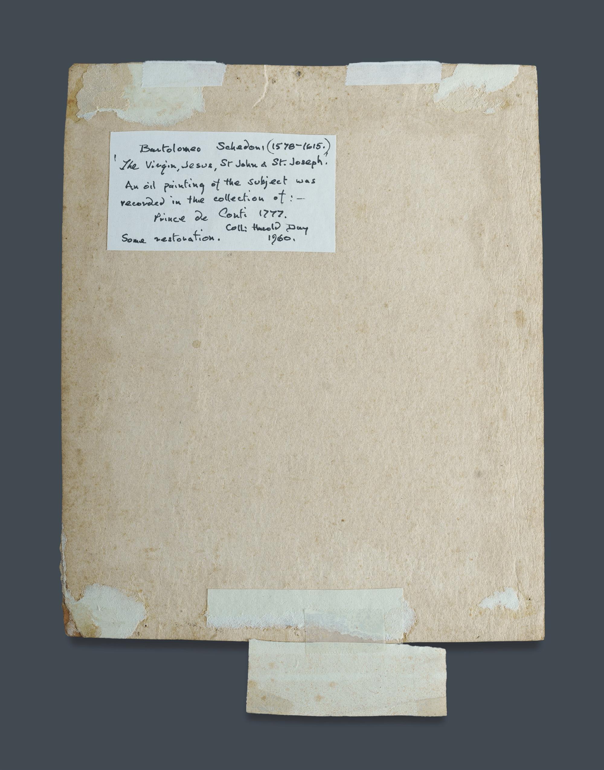 After Sisto BADALOCCHIO / Bartolomeo SCHEDONI The Virgin, Jesus, St John and St Joseph. The Day Collection (UK) stamp to margin. Inscribed in later hand verso. Pencil & Chalk 16x13.5cm (sheet)Estimate $200-400