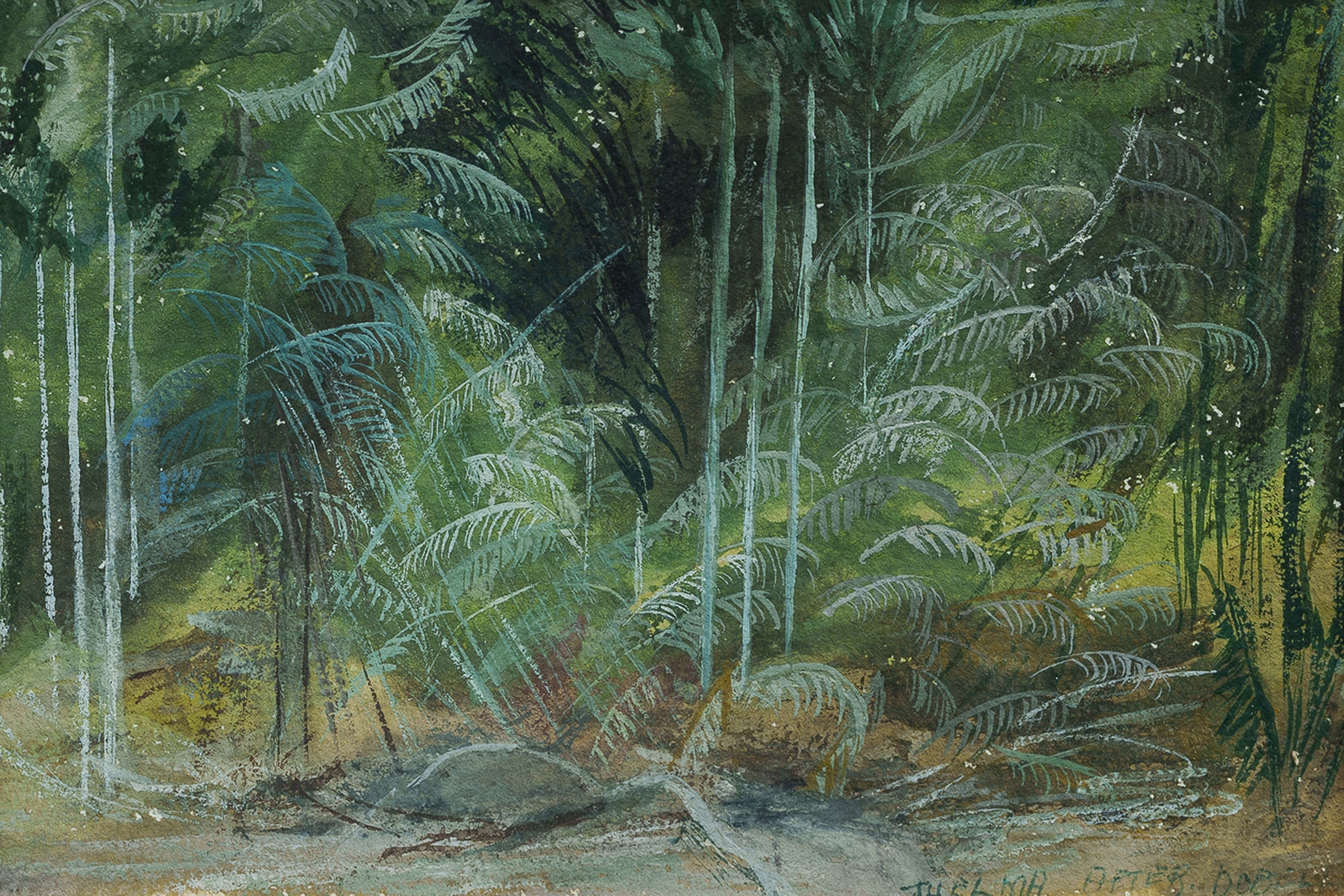 CLUNE, Thelma (1900-1992) (2) Tropical Ferns after Dobell, gouache (9.5x14.5cm); and Sydney Harbour, 1980, inscribed verso, oil on board (11x14.5cm) Both works ex John Schaeffer collection (gifted by the artist)Estimate $100-300