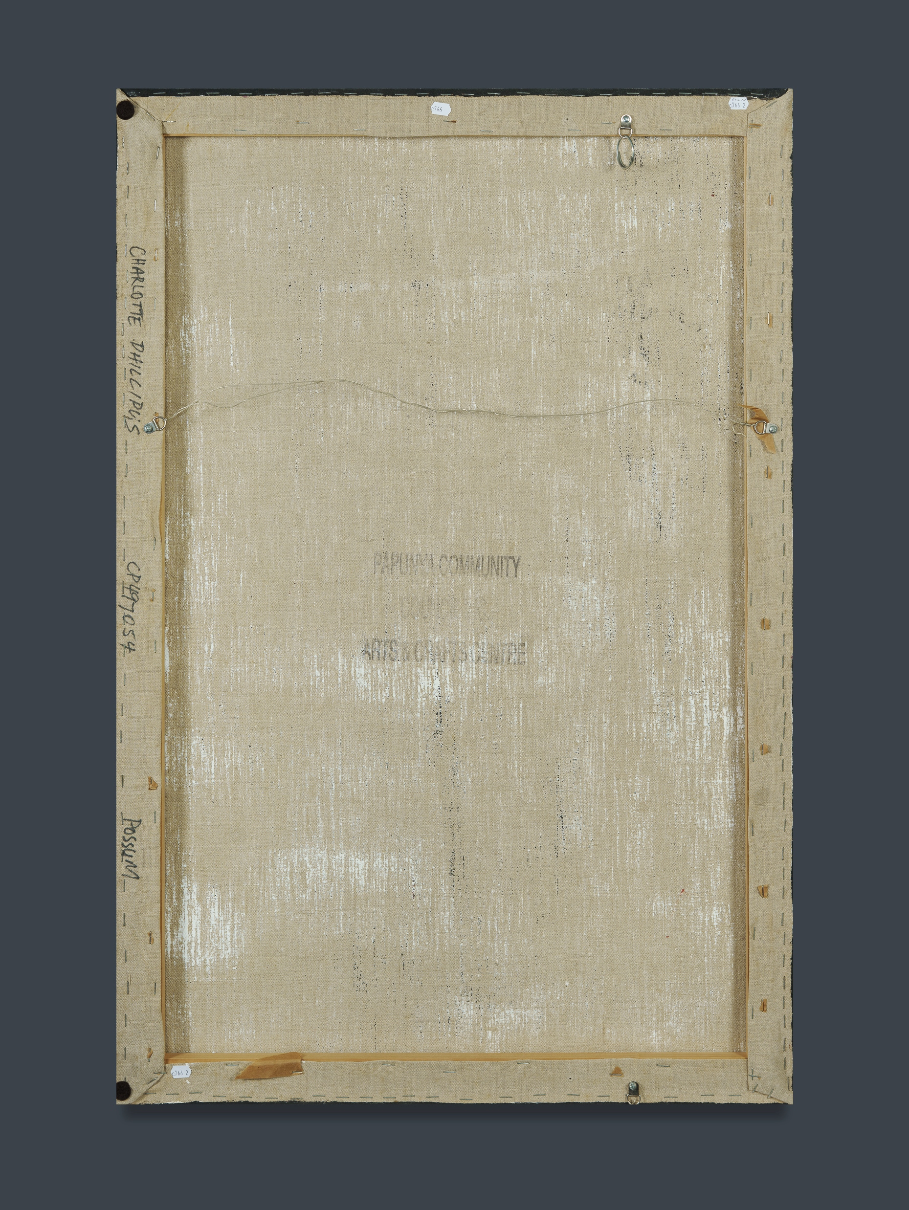NAPARRULA, Charlotte Phillipus (Aboriginal b.1957) 'Possum' Inscribed verso with artist's name, title and cat #CP497054 Acrylic on Linen 91x60.5cm PROVENANCE: Papunya Community Council (stamp verso)Estimate $300-500