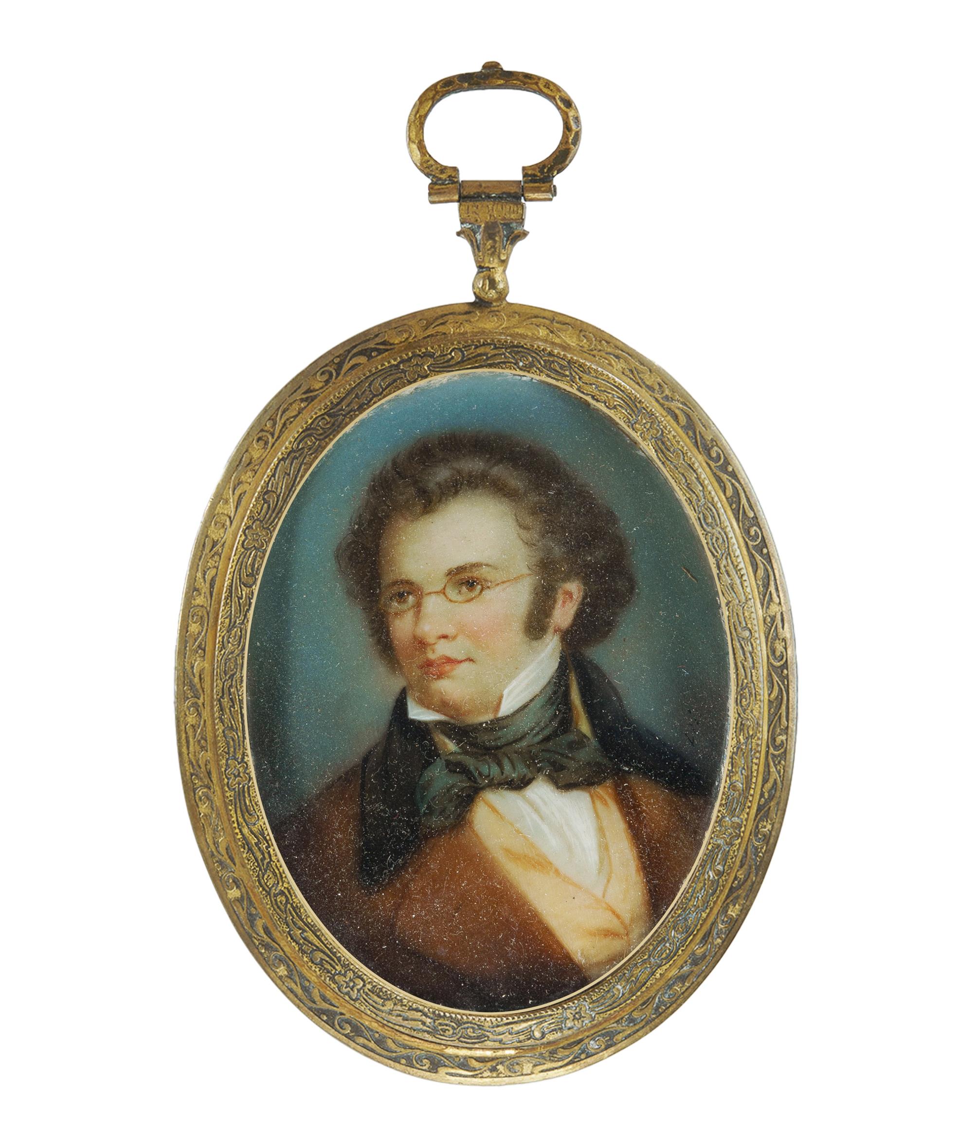 3 Miniature Portraits of Composers Depicting Wagner, Schubert and Beethoven. Each hand-painted on oval ivory panels, 2 signed 'Roy'. Set in gilt brass frames. NB: ivory export restrictions. (13x8cm frame)Estimate $300-500