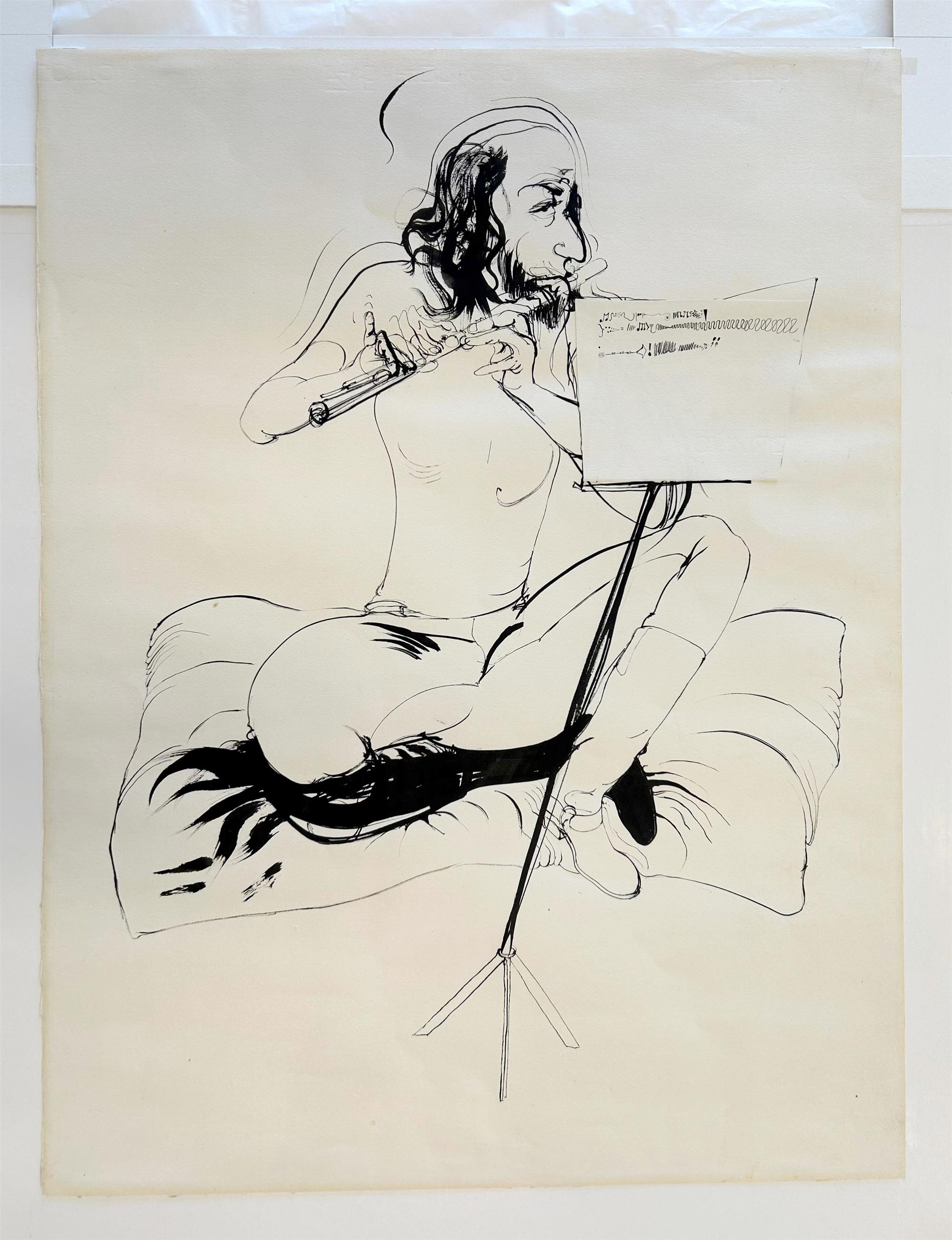 WHITELEY, Brett (1939-1992) 'Joel Elenberg Playing the Flute,' c.1975/6. Unsigned Ink on Paper with Collage 65x49cm (sight) 66x50cm (sheet) PROVENANCE: Christie's, Melbourne, November 25th 1997 (lot 201); Ken Hinds Cultural Heritage Collection, Qld. EXHIBITIONS: Caloundra Regional Art Gallery, 'Privately Collecting, Ken Hinds Cultural Heritage Collection,' Feb - Mar 2006 (catalogue included) LITERATURE: Sutherland, K., Brett Whiteley: Catalogue Raisonné, Schwartz Publishing, Melbourne, 2020, vol.7, p.320 (referenced in cat. 27.75) OTHER NOTES: © Wendy Whiteley/Copyright Agency, 2025.Estimate $45,000-65,000