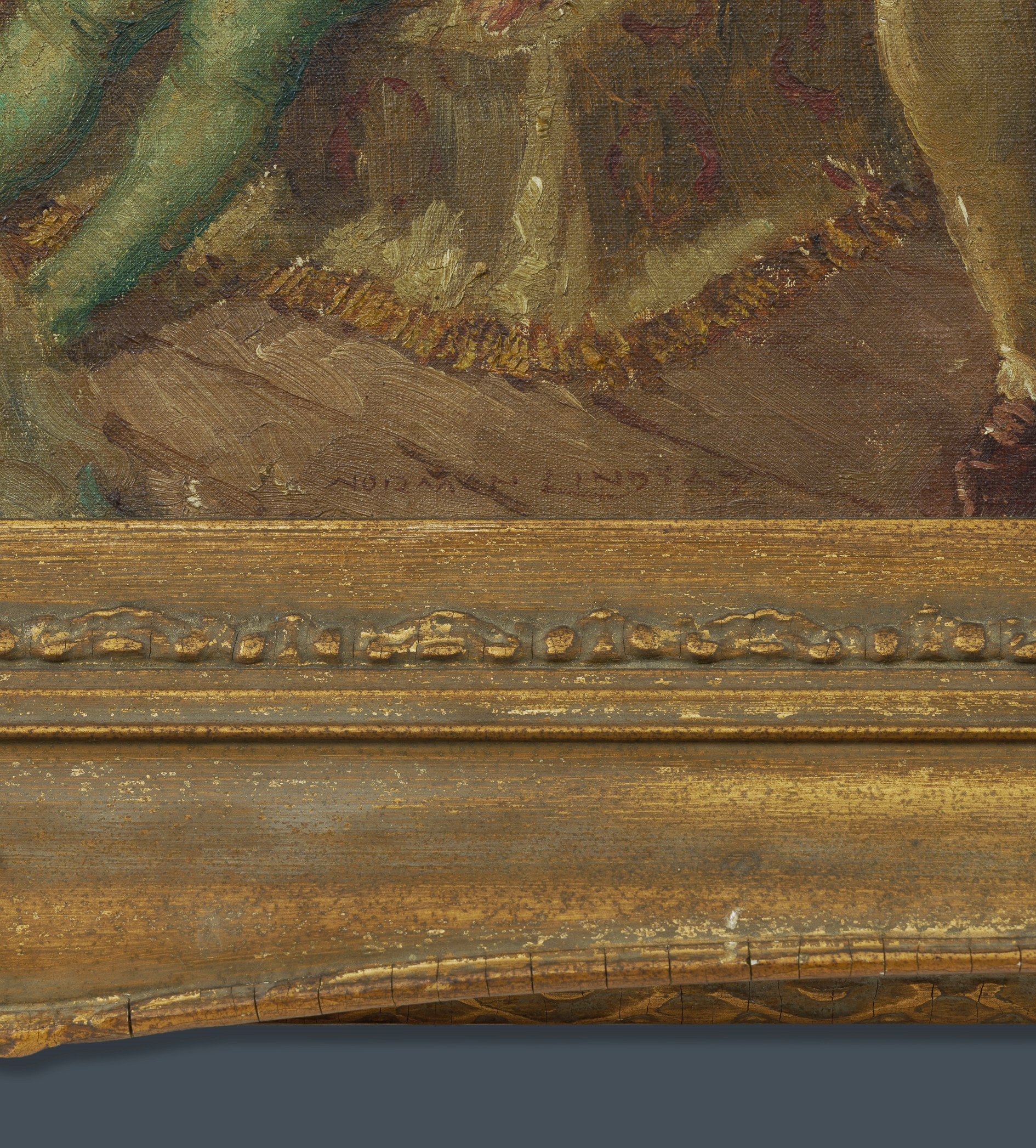 LINDSAY, Norman (1879-1969) 'Too Many Ladies' Signed lower right. Remnants of old label verso. Oil on Canvas on Board 49.5x60cm PROVENANCE: By descent, private family collection, Sydney.Estimate $30,000-50,000