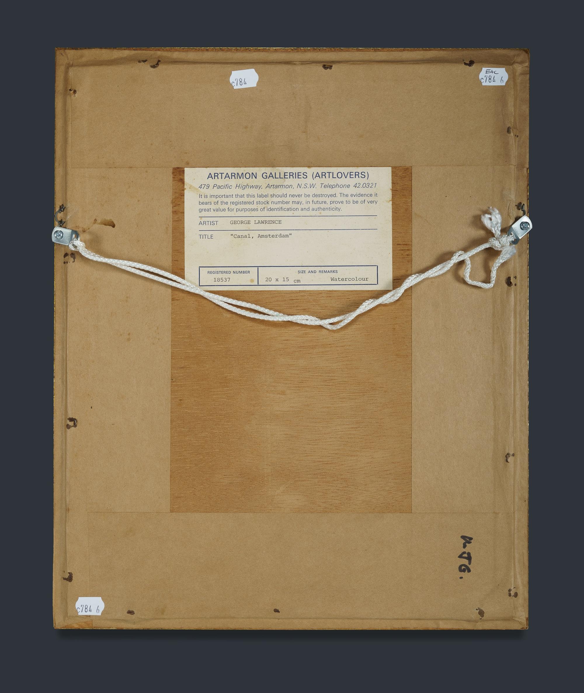 LAWRENCE, George Feather (1901-1981) 'Canal, Amsterdam' Ex Artarmon Galleries, reg. no.18537 (purchased 1983), label verso. Pencil & W/Clr 20.5x15cmEstimate $150-300
