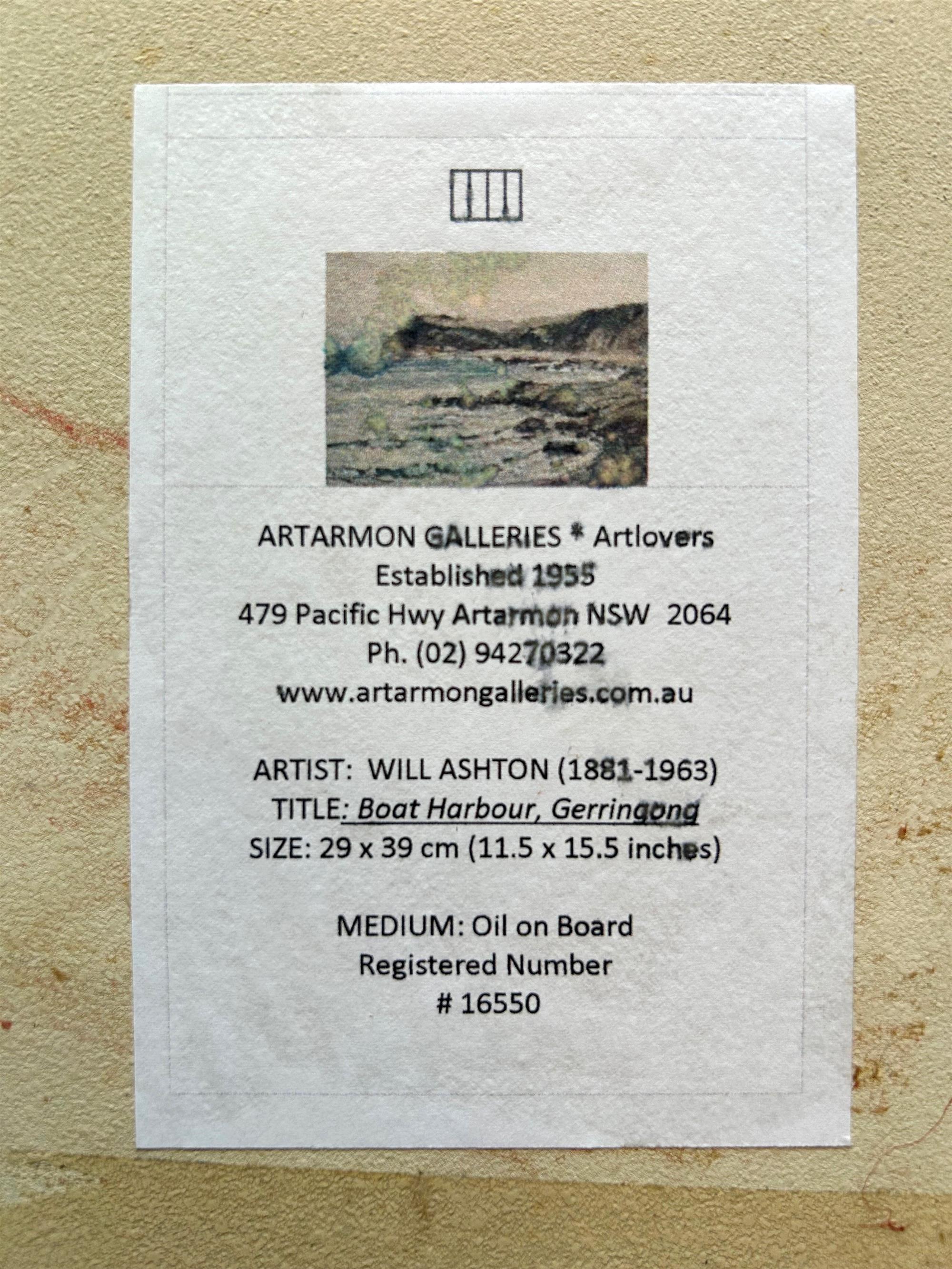 ASHTON, Will (1881-1963) 'Boat Harbour, Gerringong' Label verso for Artarmon Galleries, Sydney (reg. no.16550) No signature apparent. Oil on Board 28.5x38.5cmEstimate $1,000-1,800