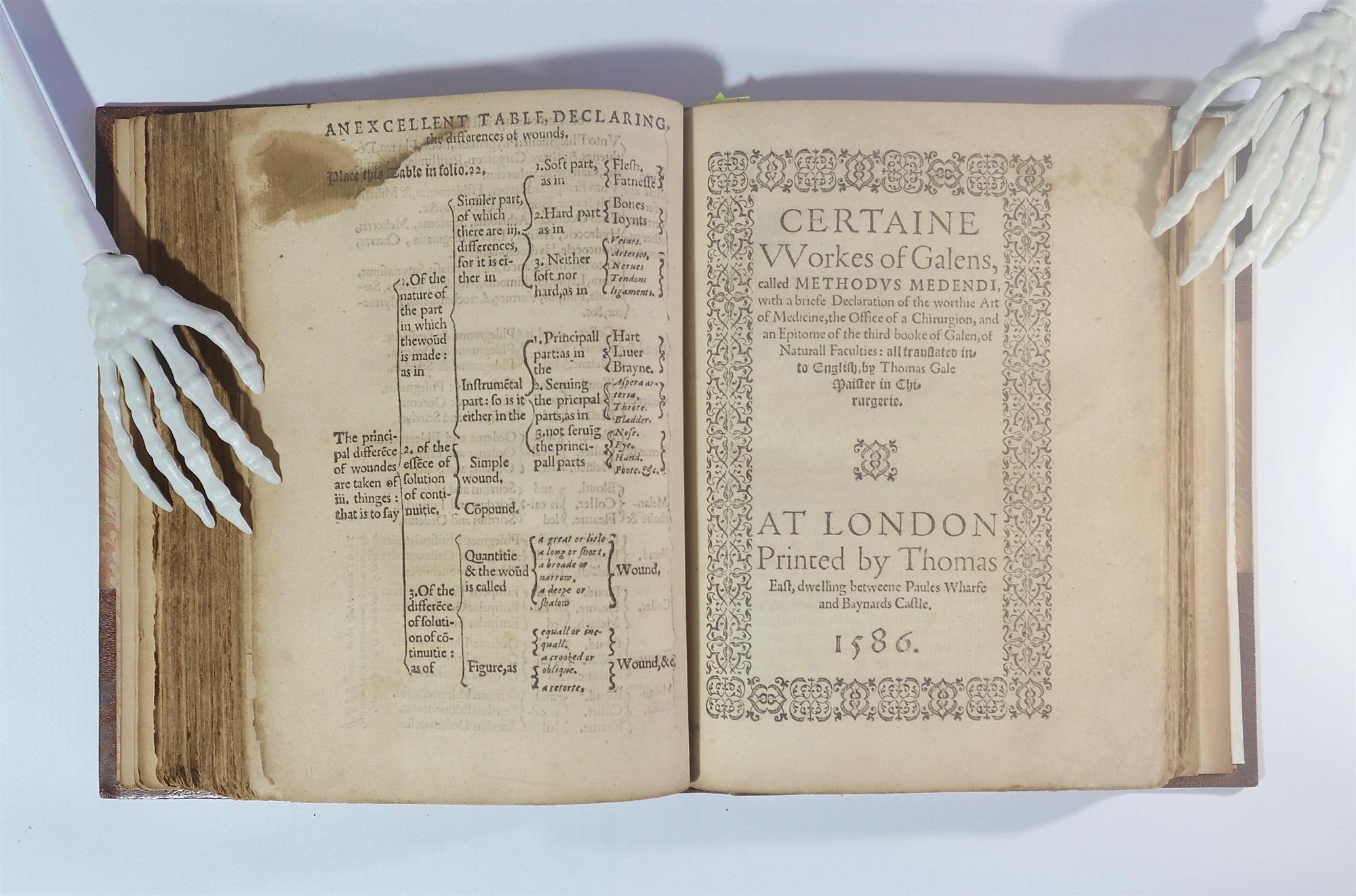 Rare and Significant - GALE, Thomas. 'Certaine Works of Chirurgerie, newlie Compiled and Published by Thomas Gale, Master in Chirurgerie' Bound in with 'Certaine Works of Galins called Methodus Medendi with a briefe Declaration of the worthie Art of Medicine, the Office of a Chirurgion, and an Epitome of the third booke of Galen, of Natural Faculties: all translated into English by Thomas Gale. Both pub. LONDON: Printed by Thomas East dwelling between Paules Wharfe and Bainards Castle, 1586. Thomas Gale, a Tudor surgeon, saw much war service in the army of Henry VIII. He was Sergent Surgeon to Elizabeth I. His book, often cited as the first surgical work written in English, is noted for its emphases on his own experience and practice. First published in 1563 this is the second edition. Note: Please see image of Russell's pencilled note to flyleaf regarding the collation; volume A lacks p.5-6, volume B (Gallens) lacks pages 121-138 (to finish). Also it's portrait frontispiece. Rebound by Zaehnsdorf in half calf on marbled boards. Text is generally toned to the edges, a few very minor losses to the bottom RH corner tips, occasional spots and marks and also waterstaining ingress from page edges. A few ink notations to margins, not overt. Images give a fair representation of condition. Bookplate of Philip Dymock Turner, book label of Edward Ford who presented the volume to K.F. Russell, and K.F. Russell bookplate. (191x147mm)