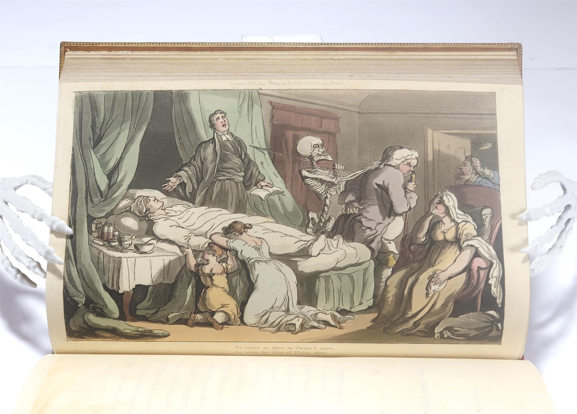 ROWLANDSON, Thomas. The English Dance of Death, from the Designs of Thomas Rowlandson, with Metrical Illustrations by the Author of "Doctor Syntax" Pub. LONDON: Printed by J. Diggens, St. Ann's Lane; Published at R.Ackermann's Repository of Arts, 101, Strand; and to be had of all the book and print-sellers in the United Kingdom. 1815. Note: Volume 1 only of issued 2 volumes. Brief collation, 158 leaves; pp. [11] iv-vii [6] 2-295 [1]. Includes 37 hand coloured aquatints. Thirty six poetic vignettes with accompanying tissue protected plates. Themes include; The Undertaker and the Quack, The Honey Moon, The Sot, The Insurance Office, etc. Binding by Tout in full brown calf with a gold ruled boards. Full gilt text block. Preliminaries foxed, occasional toning throughout text but overall a very good straight and unhandled copy. Bookplate for Alfred Lee, book label for K.F. Russell. (234x145mm)