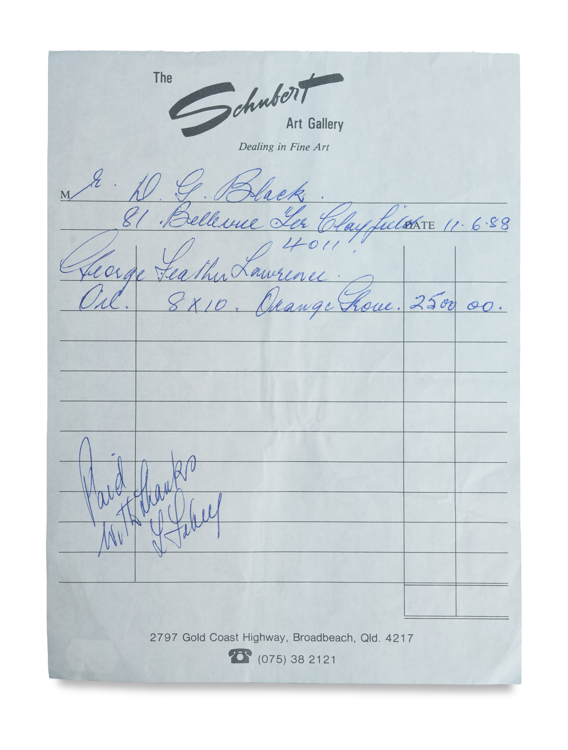 LAWRENCE, George Feather (1901-1981) 'Orange Grove (Portugal)' Signed lower right. Oil on Board 19.5x24.5cm PROVENANCE: The Schubert Galleries, Surfers Paradise, Qld (invoice supplied, dated 11th June 1988);The Estate of the Late Douglas Black, Queensland.Estimate $250-450