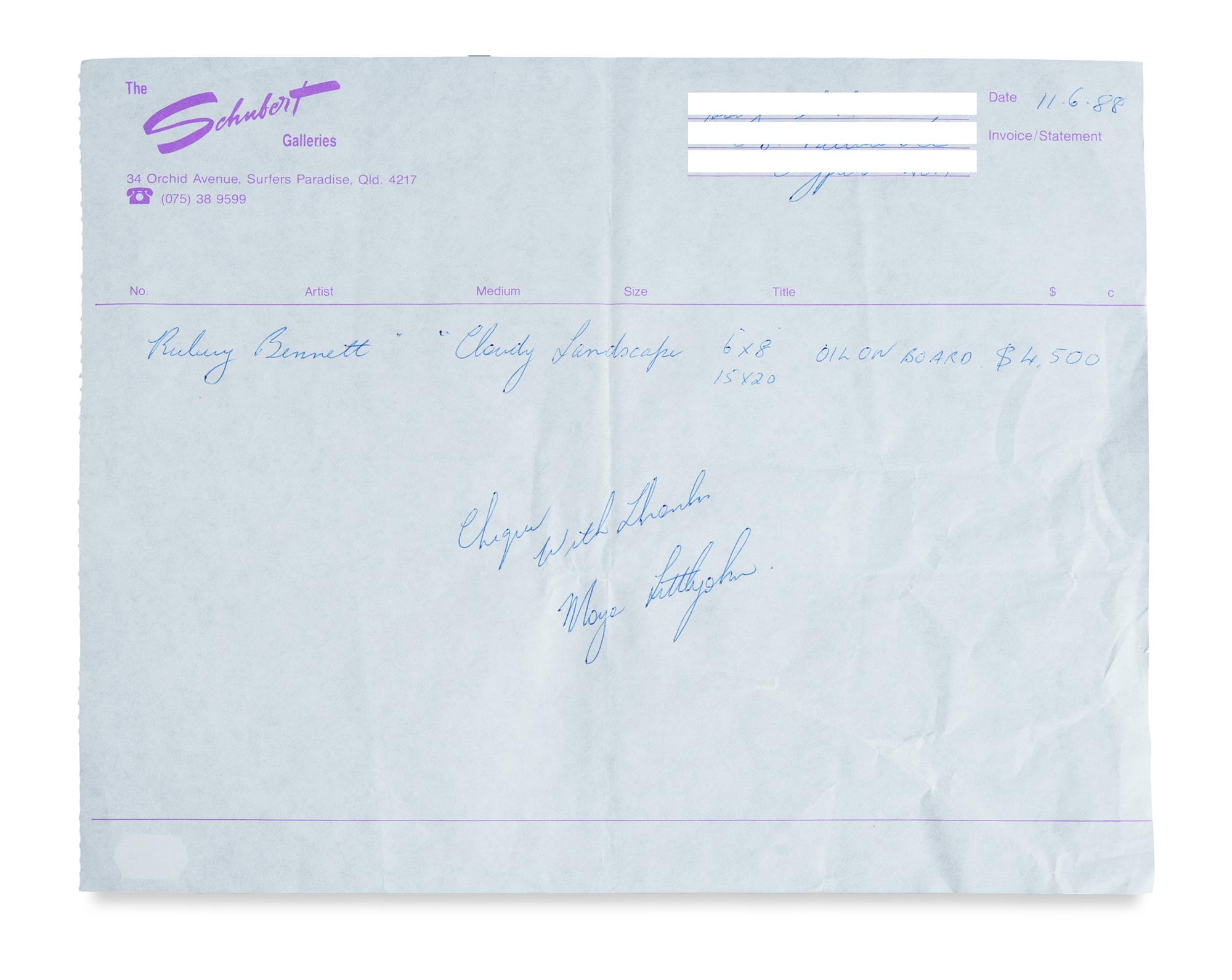 BENNETT, W Rubery (1893-1987) 'Cloudy Landscape' Signed lower left. Oil on Board 15x20cm PROVENANCE: The Schubert Galleries, Surfers Paradise, Qld (invoice supplied, dated 11th June 1988); The Estate of the Late Douglas Black, Queensland.Estimate $800-1,500
