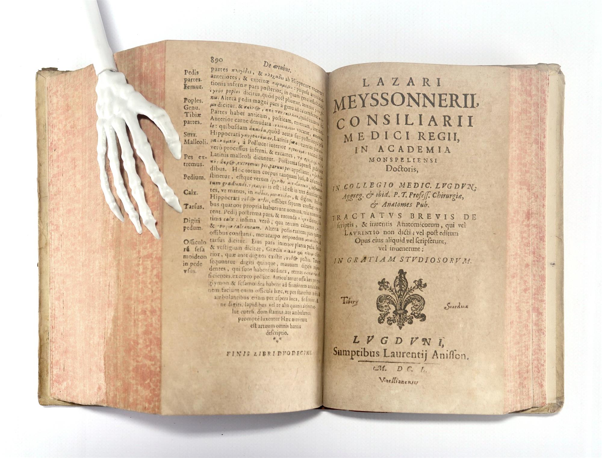 DU LAURENS, Andre. Historia Anatomica: Controvesiis, Observationibvs, et posterioribus curis Authoris adornata. Accessit Hvic Editioni nouissimæ, præter varias emendationes in prioribus desiderates, and Opusculum de Crisibus. Bound together with MEYSSONNIER, Lazari. Tractatvs brevis de scriptis, et inventis…and lastly a Du Laurens tract, 'De crisibus.' Pub. LUGDUNI: Sumpt. Laurentij Anisson, & Soc., 1650. First 1593. Title, [15] leaves, 890pp, Title (Meyssonnerii 'Tractatus brevis descriptis') pp 3- 12, Title (Laurentius 'De crisibus'), 139pp., [30] leaves. Andre du Laurens was physician to Marie de Medici and to King Henri IV. His anatomy was sound and popular, being published in many editions. Older velum binding is very worn, soiled and losses. Hinges good. Text is toned, very mild offsetting, occasional light foxing. There are numerous pencil and ink marking to margins, also frequent notes in ink. 'Guidi Octanij, Avigni' on main title, and 'Tiberij Scarduæ,' 'Vitellianensis' on title of Meyssonerii. Labels for Frederic Wood Jones, Edward Ford on pastedown plus flyleaf bookplate, Ex Libris Anatomica K.F. Russell. (186x115mm)