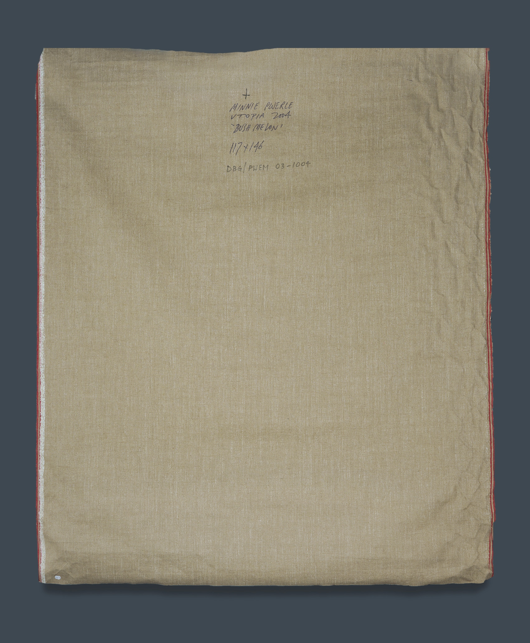 PWERLE, Minnie (Aboriginal 1922-2006) 'Bush Melon,' 2004. Signed and inscribed verso: DBG/PWEM 03-1004. Acrylic on Linen 146x116cm PROVENANCE: Russell Guy, Didgeridoo / Artifacts, NT (certificate of authenticity supplied)Estimate $3,500-4,500
