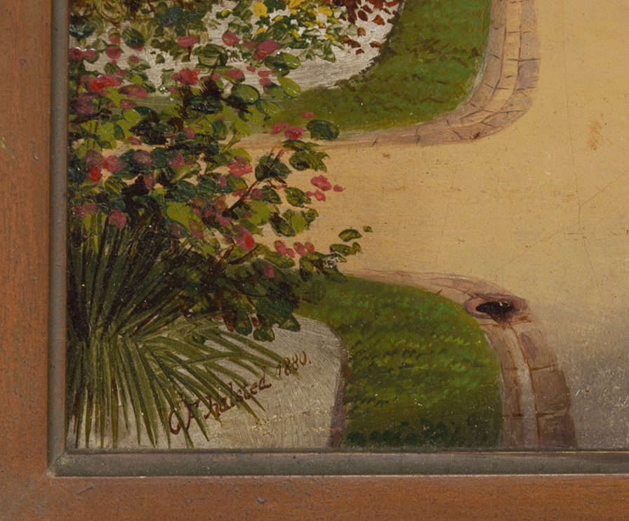 HALSTEAD, George F (working 1860s-1880s) Path Through Sydney Botanic Gardens with Azaleas and View to Government House. 1880. Signed and dated lower left. Oil on Board 31.5x44cm