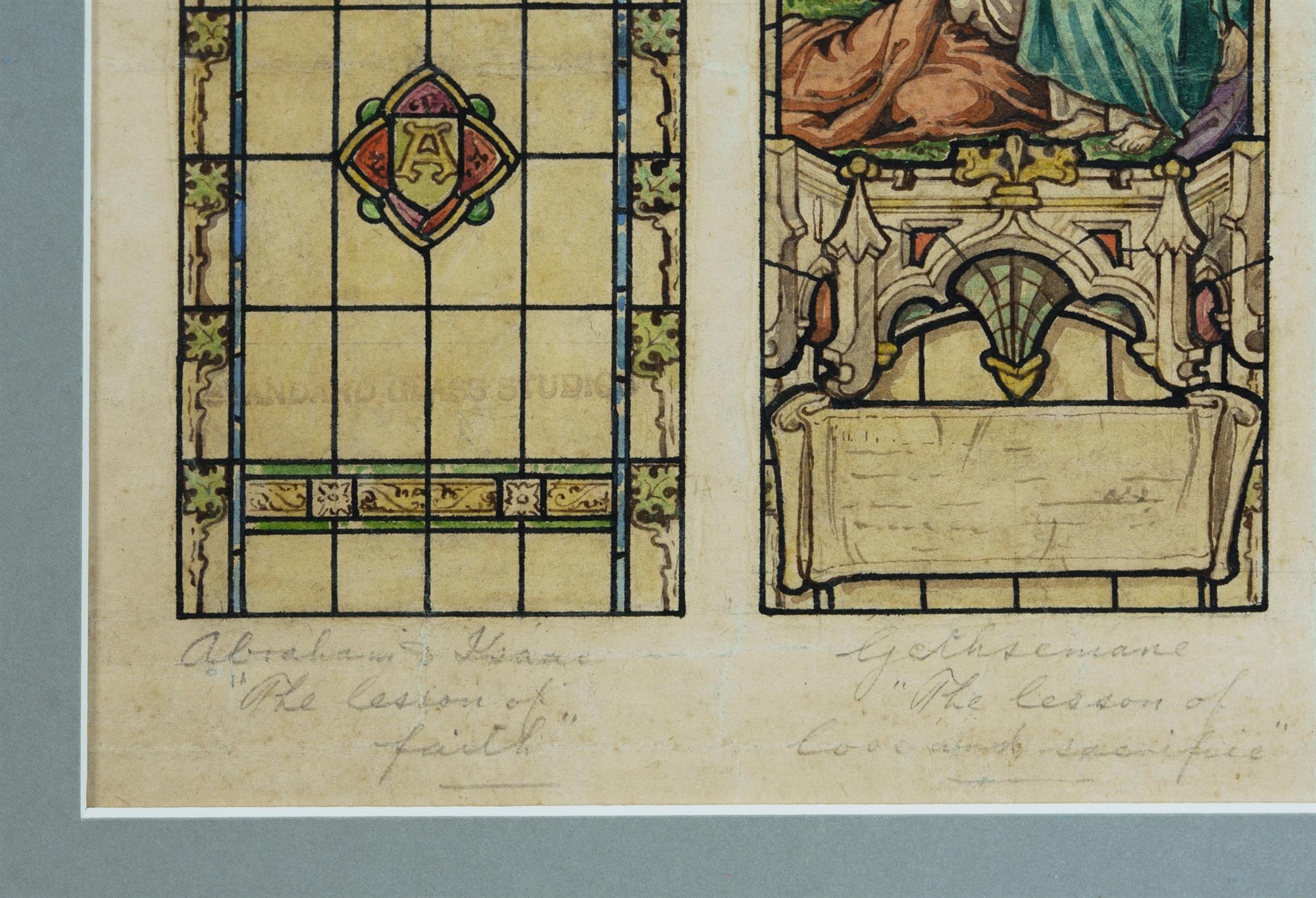 VERRALL, Walter (Wally) Stained Glass Window Designs: 'The Lesson of Faith (Abraham and Isaac)', 'The Lesson of Love and Sacrifice (Gethsemane)', and 'The Lesson of Help, Tenderness and Pity (The Good Samaritan)' Signed under matboard. Stamped by Standard Glass Studios, Sydney. W/Clr, Ink & Pencil 43.5x28cm (sight)