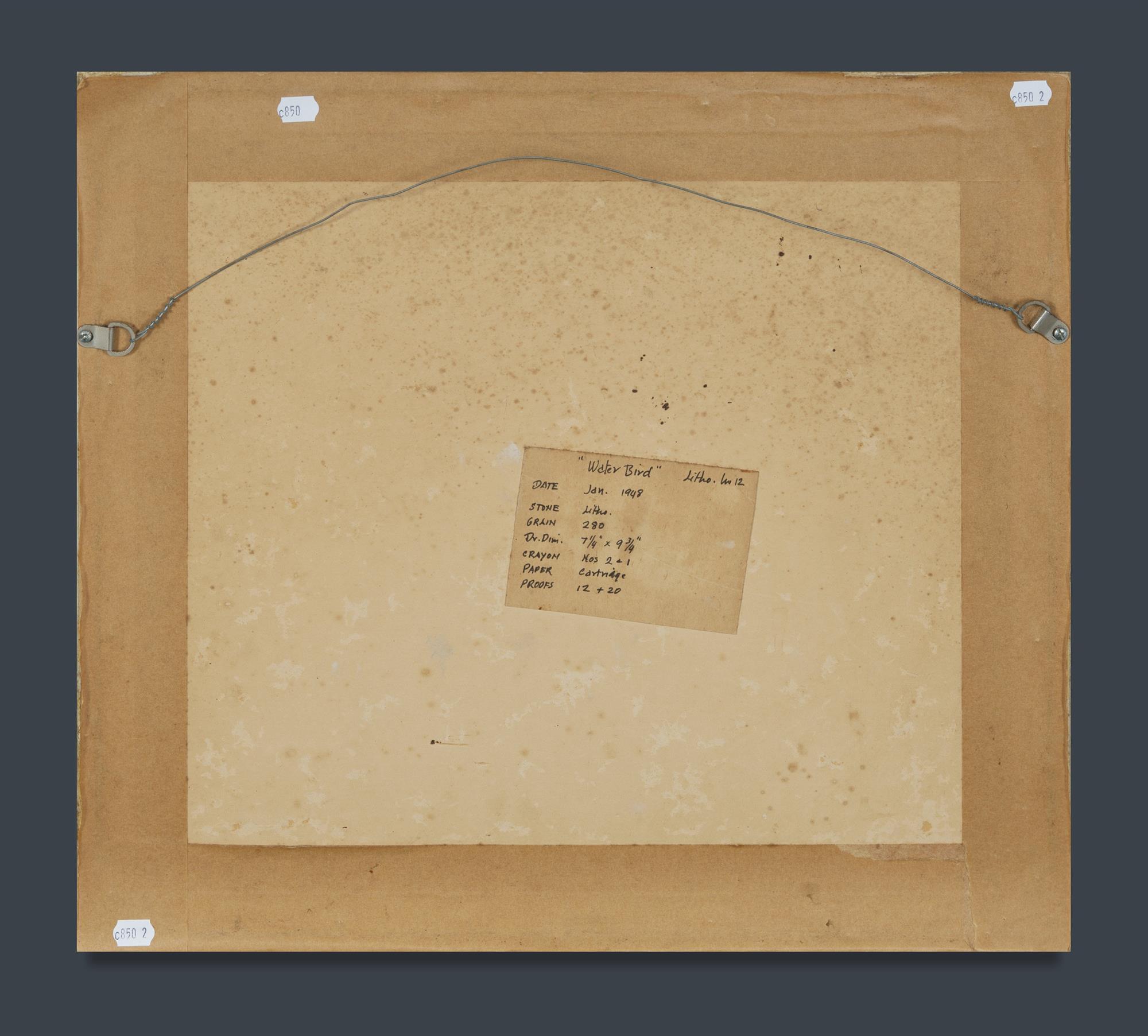 HINDER, F C (Frank) (1906-1992) Water Bird,' 1948. Signed lower right; old label right. Lithograph No.12 18x24.5cm (image) PROVENANCE: Keith Free Collection, Sydney.Estimate $400-600