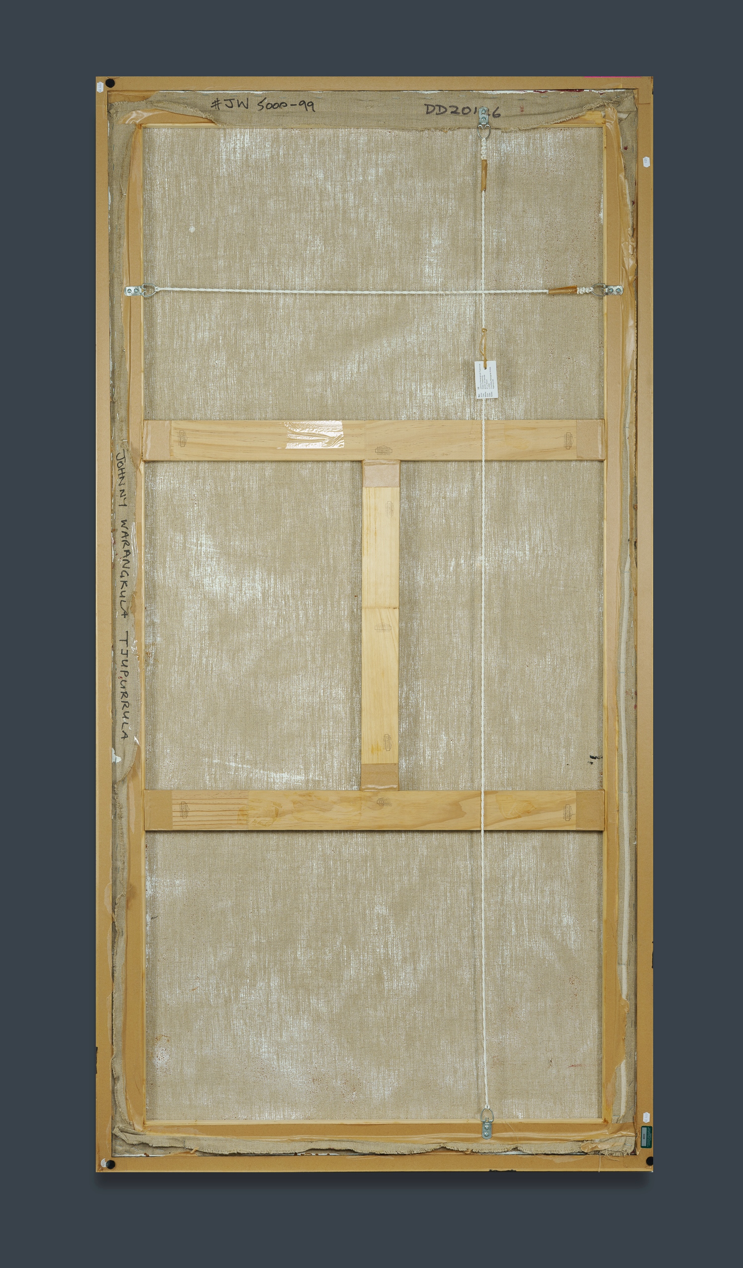 TJUPURRULA, Johnny Warangkula (Aboriginal c.1925-2001) 'Water Dreaming,' 1999. Inscribed verso with artist's name. Acrylic on Linen 183x92cm PROVENANCE: Yanda Aboriginal Art, cat#JW5000-99 (inscribed verso); Desert Dreaming Art, Buderim, Qld, cat#DD20126 (certificate of authenticity & numerous work in progress photos); Ken Hinds Cultural Heritage Collection, Qld.Estimate $1,500-3,000