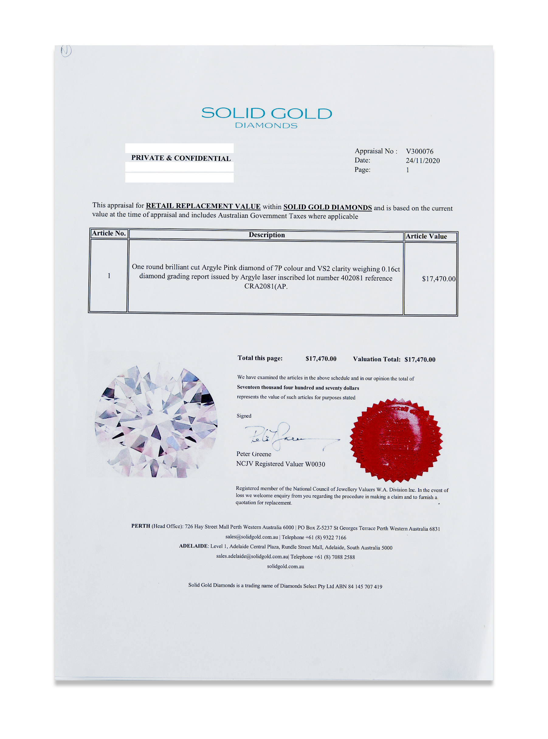 Argyle Pink Diamond 0.16ct Argyle pink diamond with colour 7P and clarity VS2. Includes Argyle certificate and laser-inscribed lot number 402018.Estimate $7,000-12,000