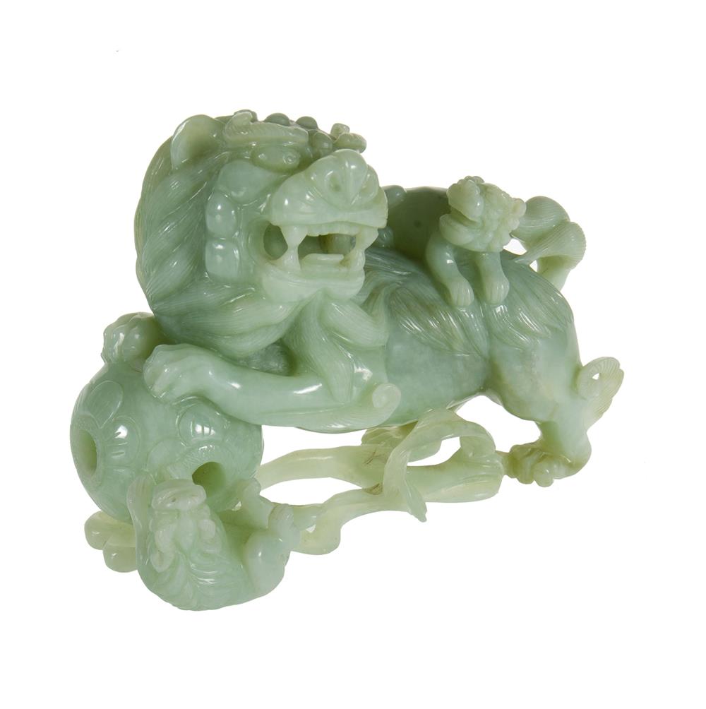 Chinese Jade Guardian Lion and Cubs. Well carved guardian lion with ball & two playful cubs, on a fitted wooden base. H12cm (figure only) Estimate $300-500