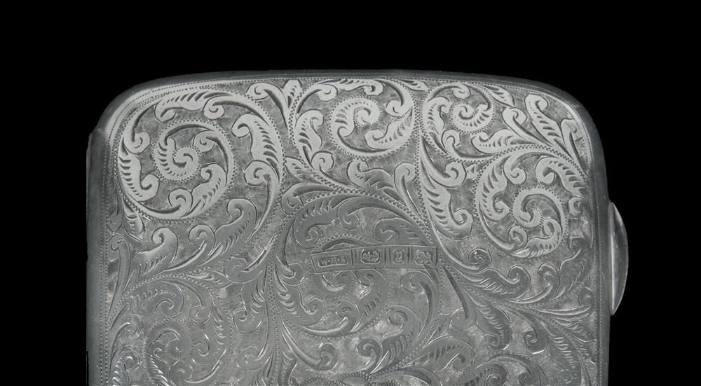 Vict. HMSS Cigar Case. Birmingham 1898, maker W.H.L. Gilt interior, scrolling engraved decoration, central rondel with monogram. W193g Estimate $100-200