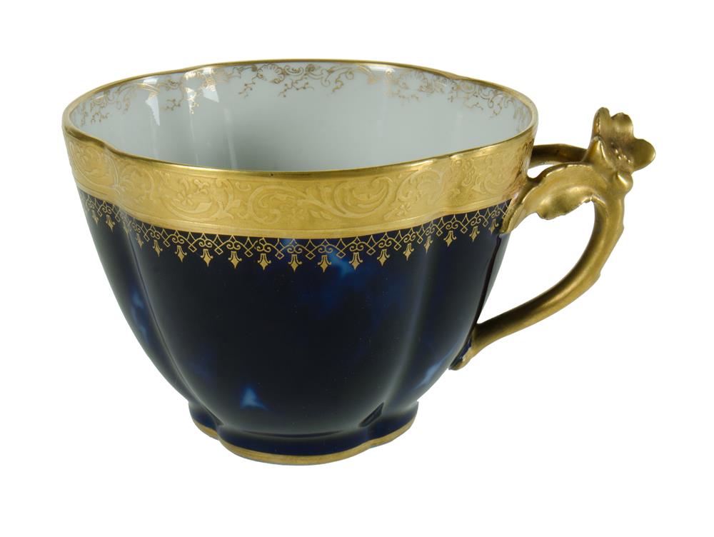 Limoges Tennis Cup & Saucer. Cobalt with heavy gilt encrusted borders. Floriform handles. L27cm Estimate $50-100