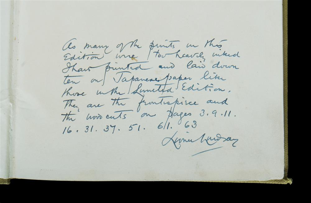 BOOK, 'Discobolus and Other Verse.' By Lionel Lindsay, pub. F W Cheschire, Melbourne 1959. No.323 of 350. Contains 10 original woodcuts & author's inscription. Estimate $300-500
