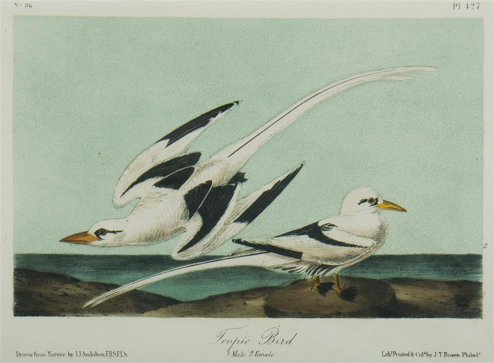 After AUDUBON, John (USA 1785-1851), 3 Various Engravings. 'Tropic Bird' (12x18cm) plate 427; 'Marvell's Tern' (17x11cm) plate 434; & 'Trudeau's Tern' (10x20cm) plate 435. Together with a coloured etching 'Rhea, American' (15x9cm). Steel Plate Engravings (3) Estimate $100-200