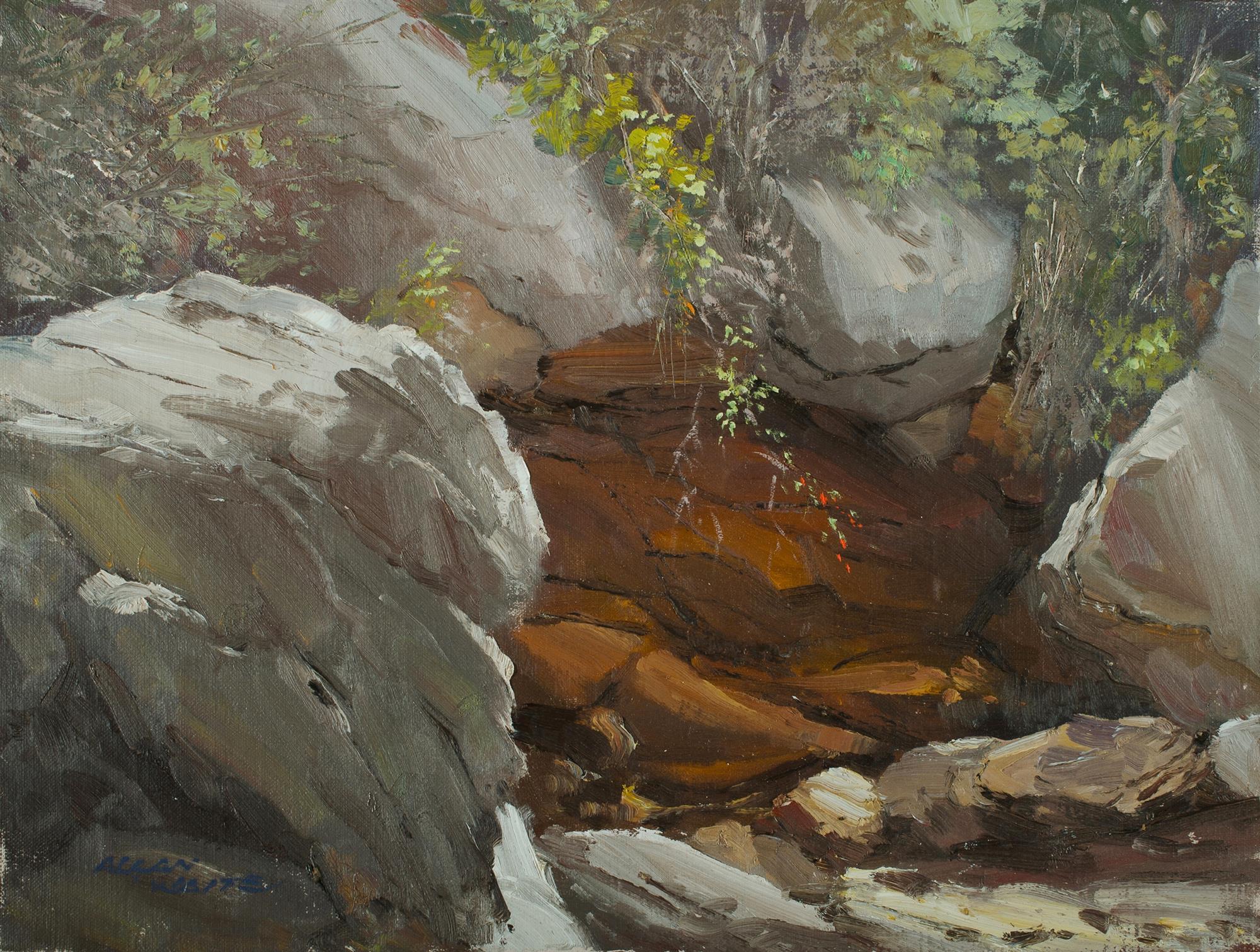 WAITE, Allan (1924-2010) (2) 'Shadowed Sandstone, Forty Baskets' (30x40cm); & 'Castle Rock [Middle Harbour, Sydney]' (30.5x41cm). Oil on Canvas on Board (2)Estimate $100-200