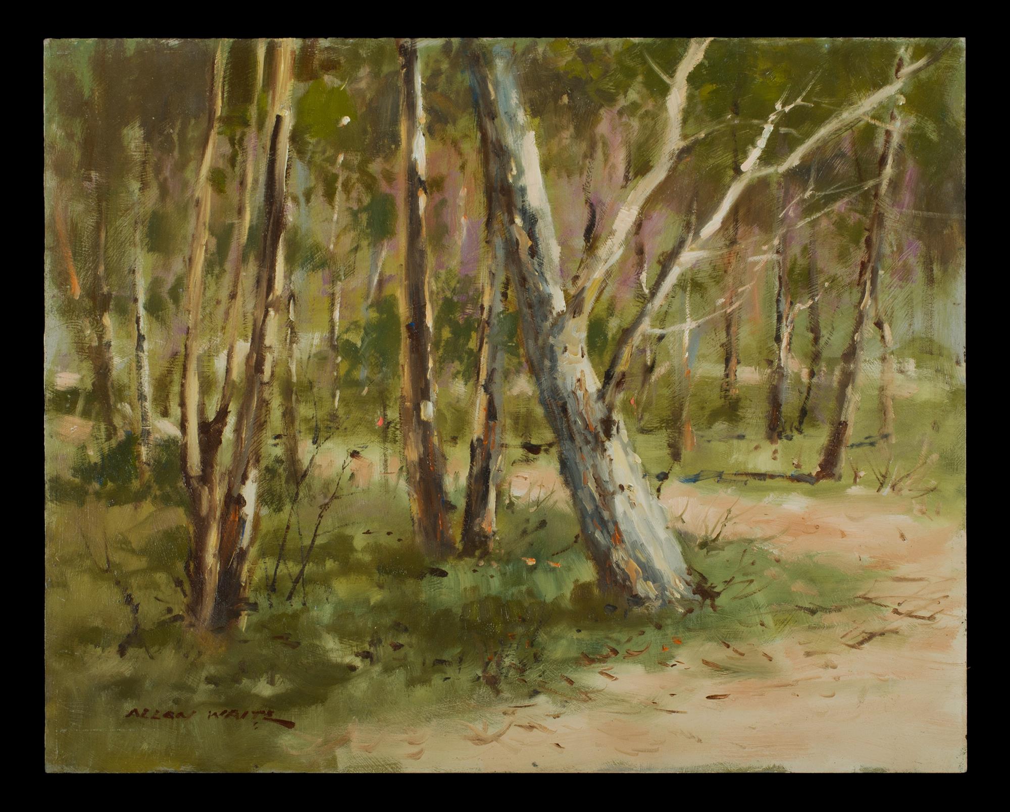 WAITE, Allan (1924-2010) (2) 'Warriewood,' from MUGC Clubhouse, c1963 (oil on canvas board); & 'Candlebark Forest' (oil on board) 40x51cm (each)Estimate $80-150