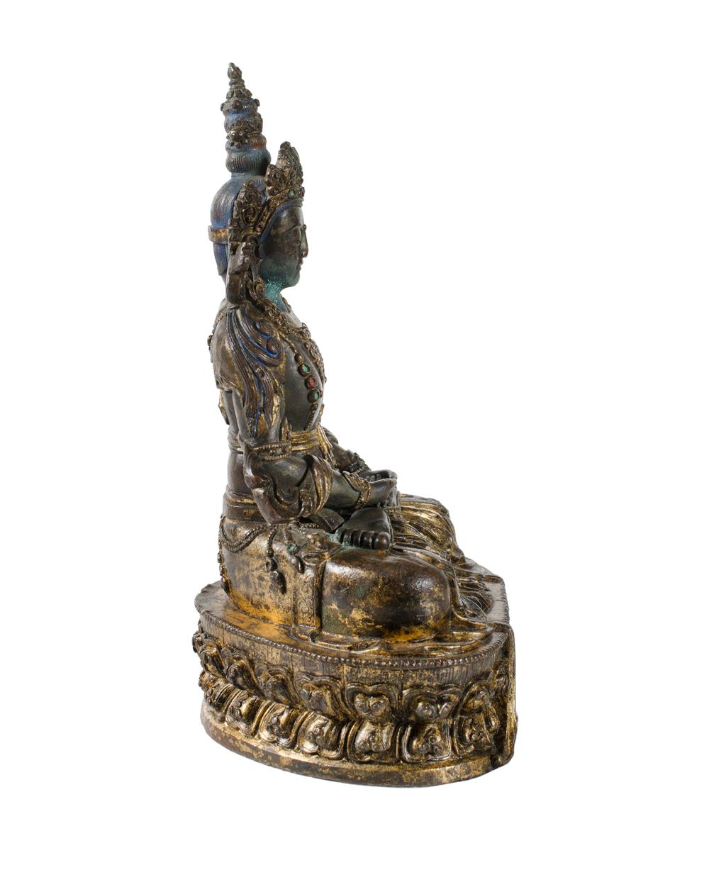 Gilt Bronze Figure of Amitayus. Seated on a double lotus base, with his hands on his lap. Dressed in loose robes, tiara & conical headdress. Ex Ray Tregaskis Oriental Art. (H22cm) Estimate $800-1,500