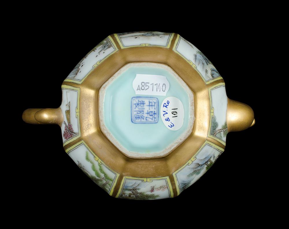 Chinese Famille Rose Porcelain Teapot. Eight panels, decorated with delicate landscapes, gilt spout & handle. Bears six character mark to base. (H10cm) Estimate $80-150