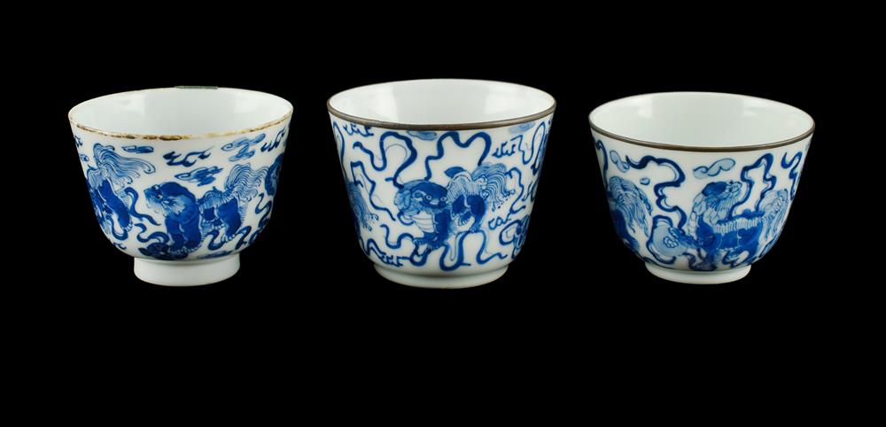 3 Chinese Blue & White Porcelain Cups. Each decorated with Buddhist lions, studio marks to each. Together with a blue & white dish decorated with scholars objects. Dia 14cm (dish) Estimate $100-200