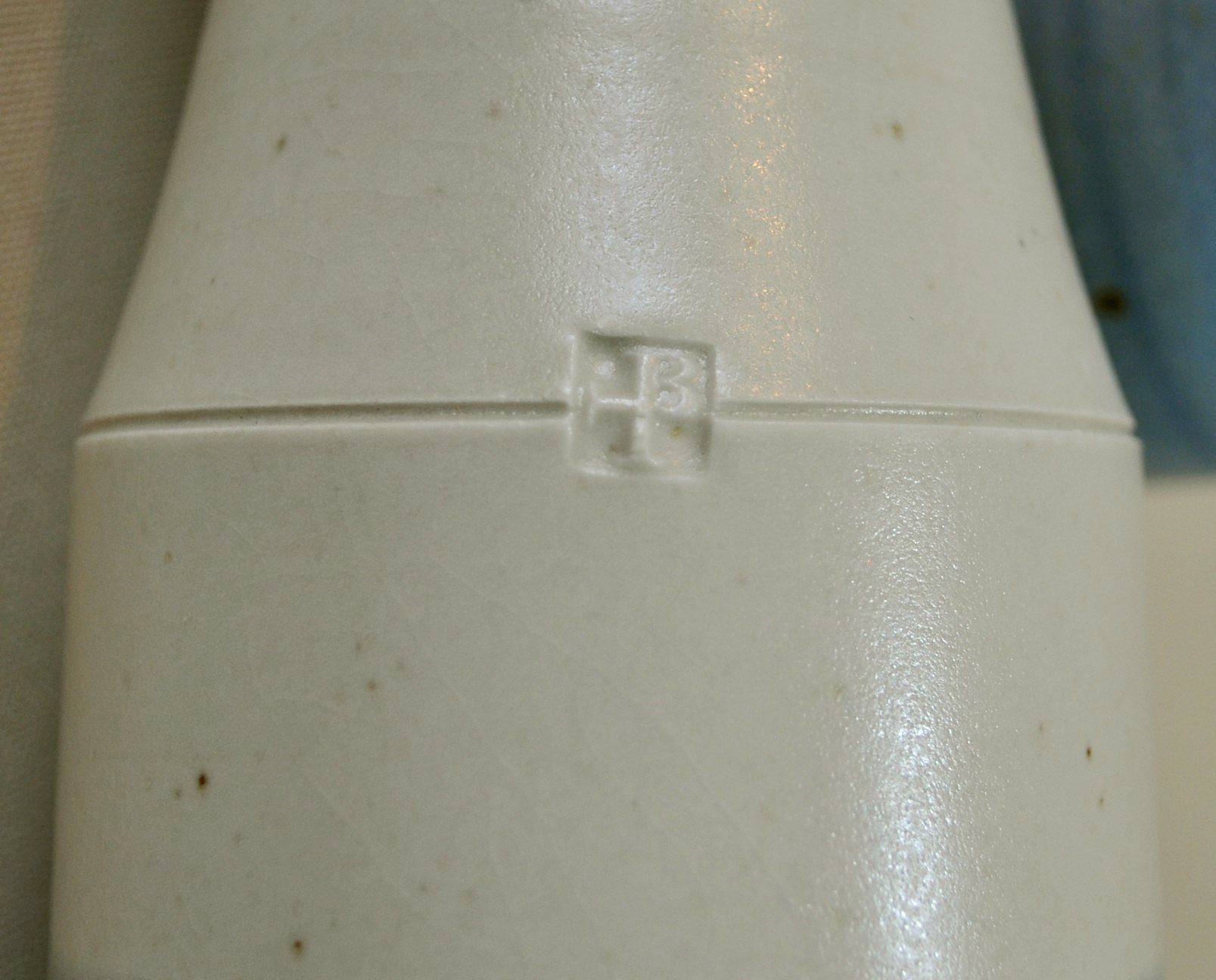 SMITH Derek 1931-2019), Two Buff Stoneware Carafes. Ash glaze with brushed cobalt bands, three impressed seals 'Blackfriars Pottery Studio.' (H32cm each). Together with pair of 'Blackfriars' stoneware salt & pepper pots. Cylinder shape with ash & iron glaze, unglazed bands & discs (H8cm). Estimate $300-400