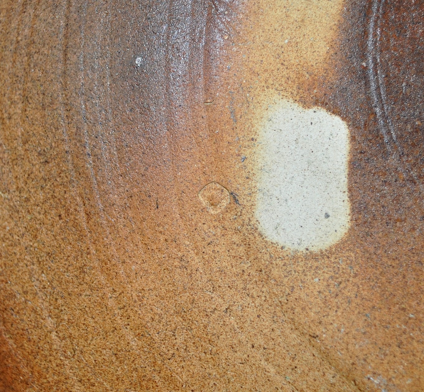Potter Unknown, Large Coarse Stoneware Rimmed Bowl. Bizen type firing, combed pattern to outer rim, magnesium glaze interior with brushed cobalt fruit, & brushed iron black whimsical cat's face. Potter's seal to base. (Dia 38cm)Estimate $300-400