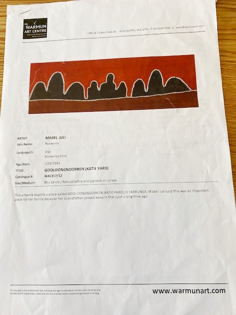 JULI, Mabel (Aboriginal b.1933) Gooloongnoorren (Katie Yard) Inscribed verso with Warmun Art Centre cat. #WAC 157/12 (certificate available) Natural Earth Pigments on Canvas 90x30.5cmEstimate $600-1,000