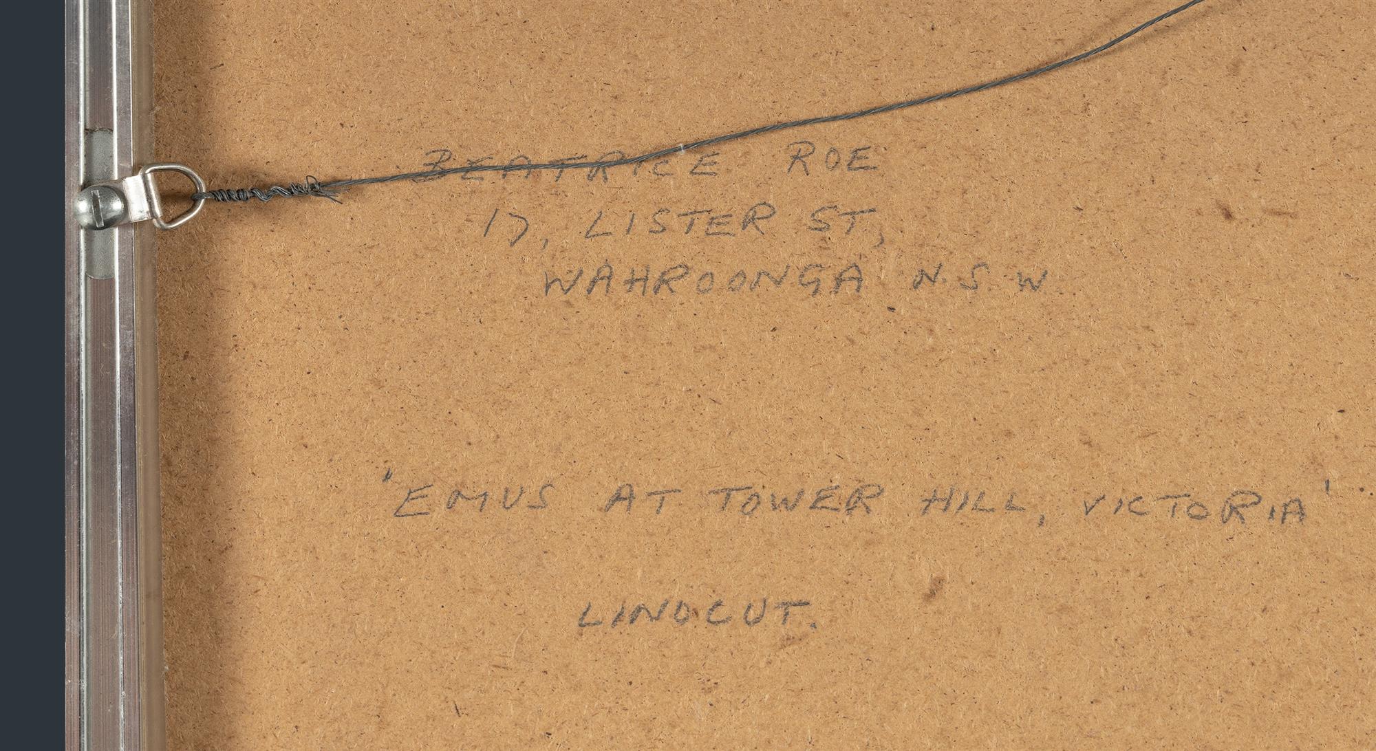 ROE, Beatrice (1920-2019) (3) 'Emus at Tower Hill, Victoria,' 1984, ed 1/6 (15x22cm); 'Emus at Tower Hill, Vic. 2,' 1984, ed. 6/12 (15x30.5cm); & 'Still-life with Napkin,' 1987, ed. 4/8 (7x30cm). Linocut (3)Estimate $60-120