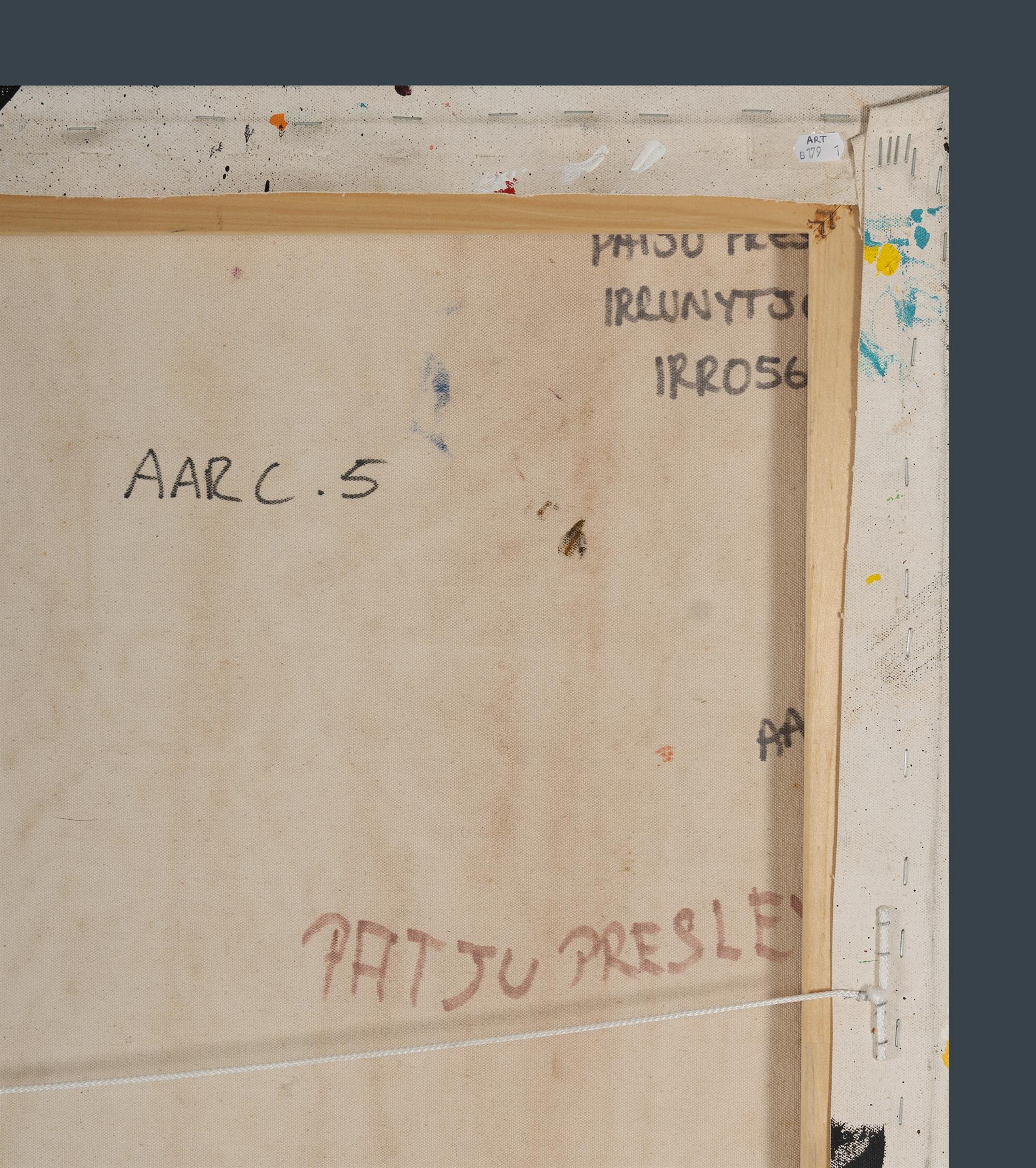 PRESLEY, Patju (Aboriginal born c.1940) Untitled, 2005. Signed & inscribed verso with Irrunytju Arts Centre provenance, cat #IRR05602. Also inscribed 'AARC.5.' Acrylic on Canvas 163x130cmEstimate $1,500-2,500