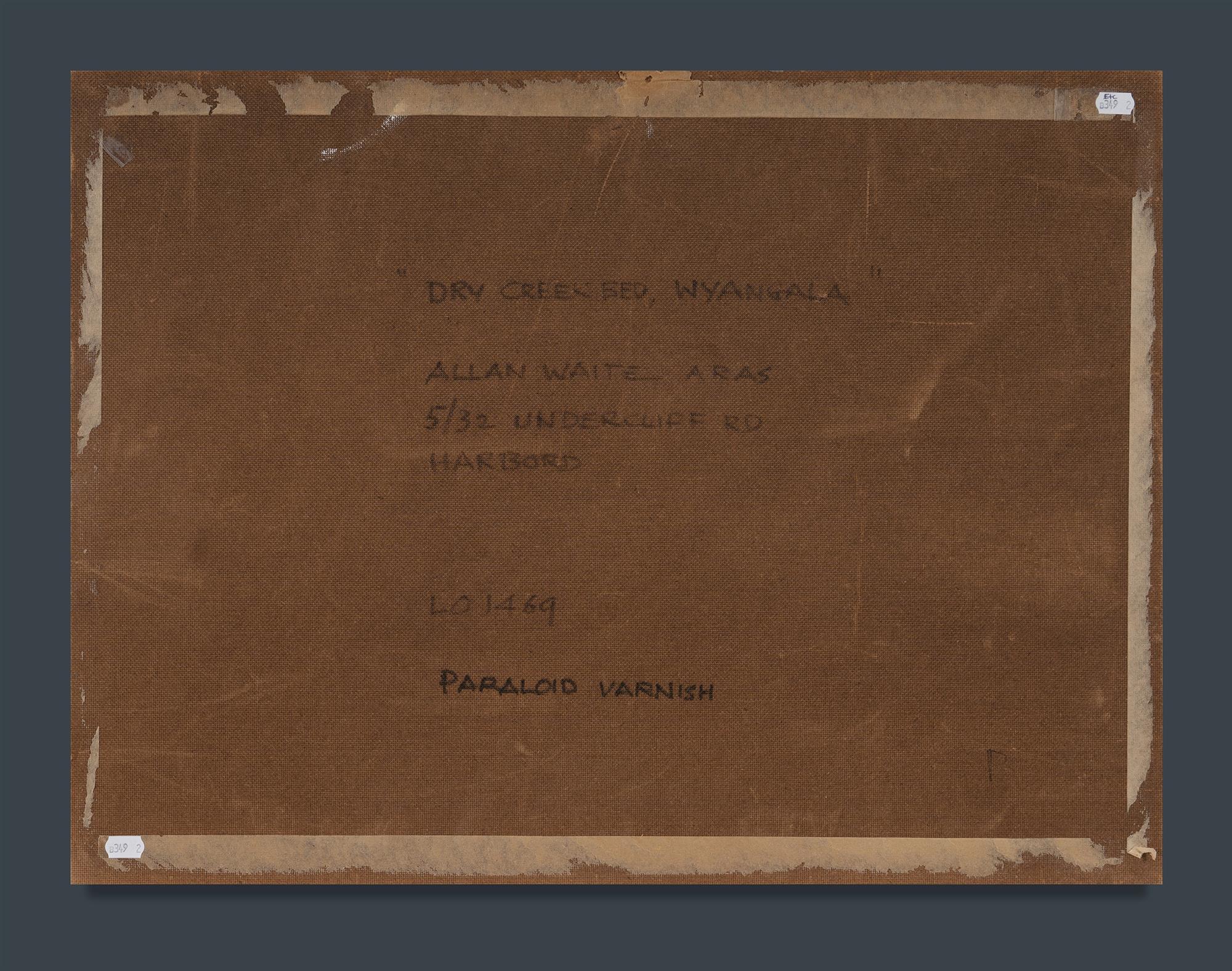 WAITE, Allan (1924-2010) 'Dry Creek Bed, Wyangala' Titled and inscribed verso. Oil on Board 46x61xmEstimate $100-200