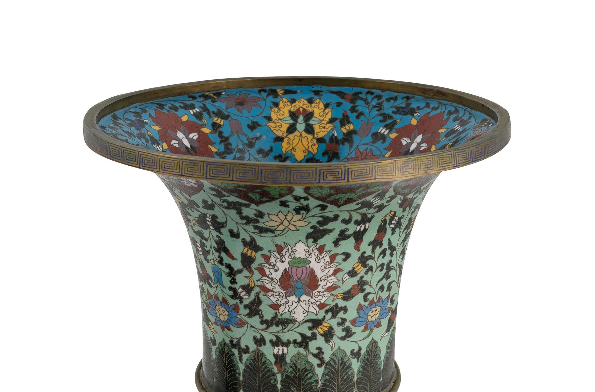 Pr Large Proportioned Chinese Cloisonne Gu Vases. 19th/20th C foliate decoration on a blue ground. (H57.5cm)Estimate $1,000-2,000
