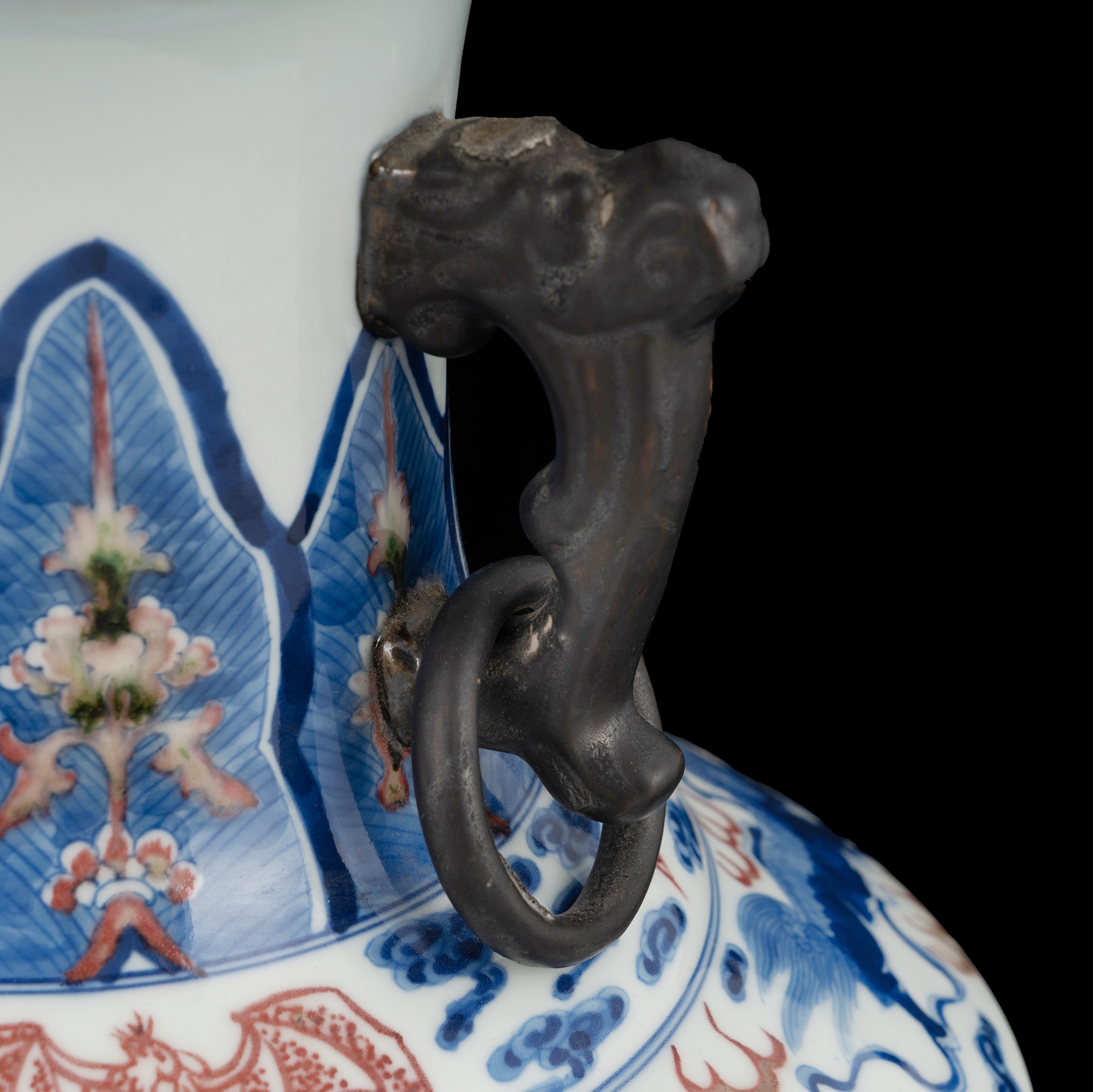 Chinese Blue & White Underglaze Red Vase. Twin handles with rings, decorated with bats, kirin & dragons. Qianlong mark to base. On wooden stand. (H36cm)Estimate $400-600
