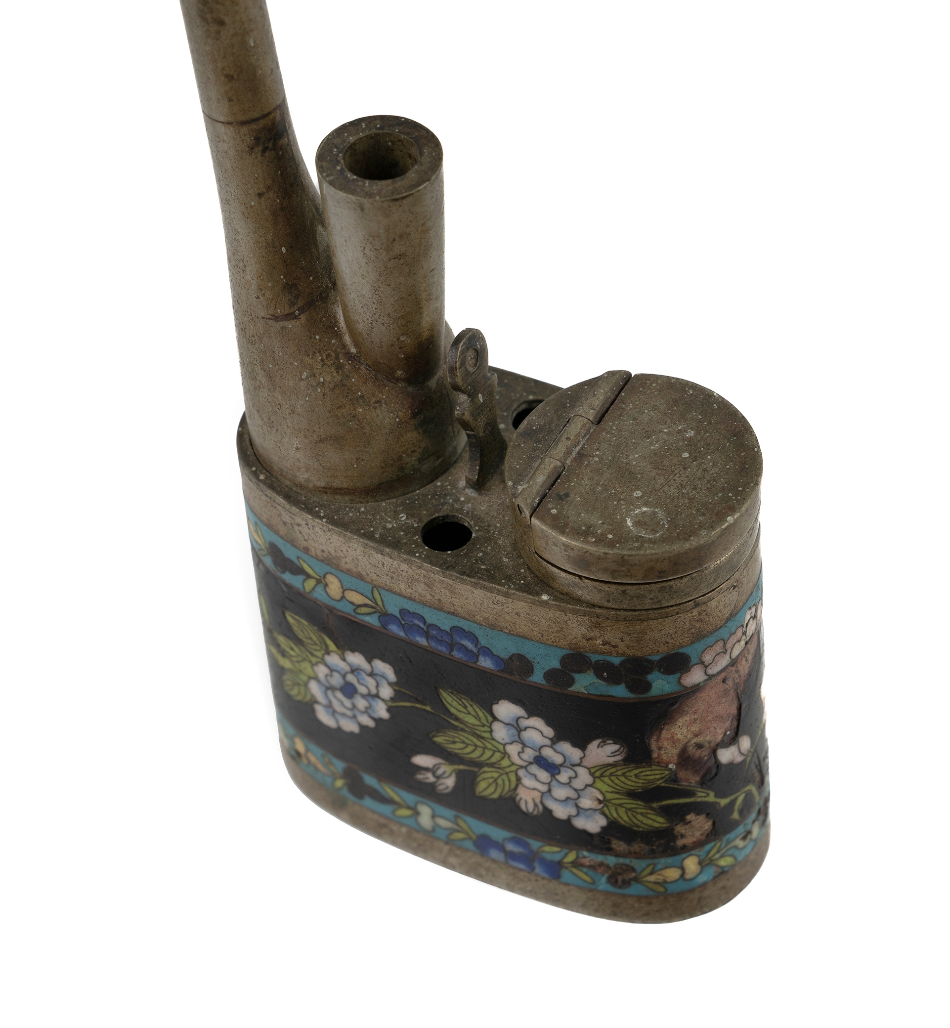 Chinese Water Pipe. Floral cloisonne band, white flowers on a black ground. Losses to cloisonne. (H28cm)Estimate $40-80