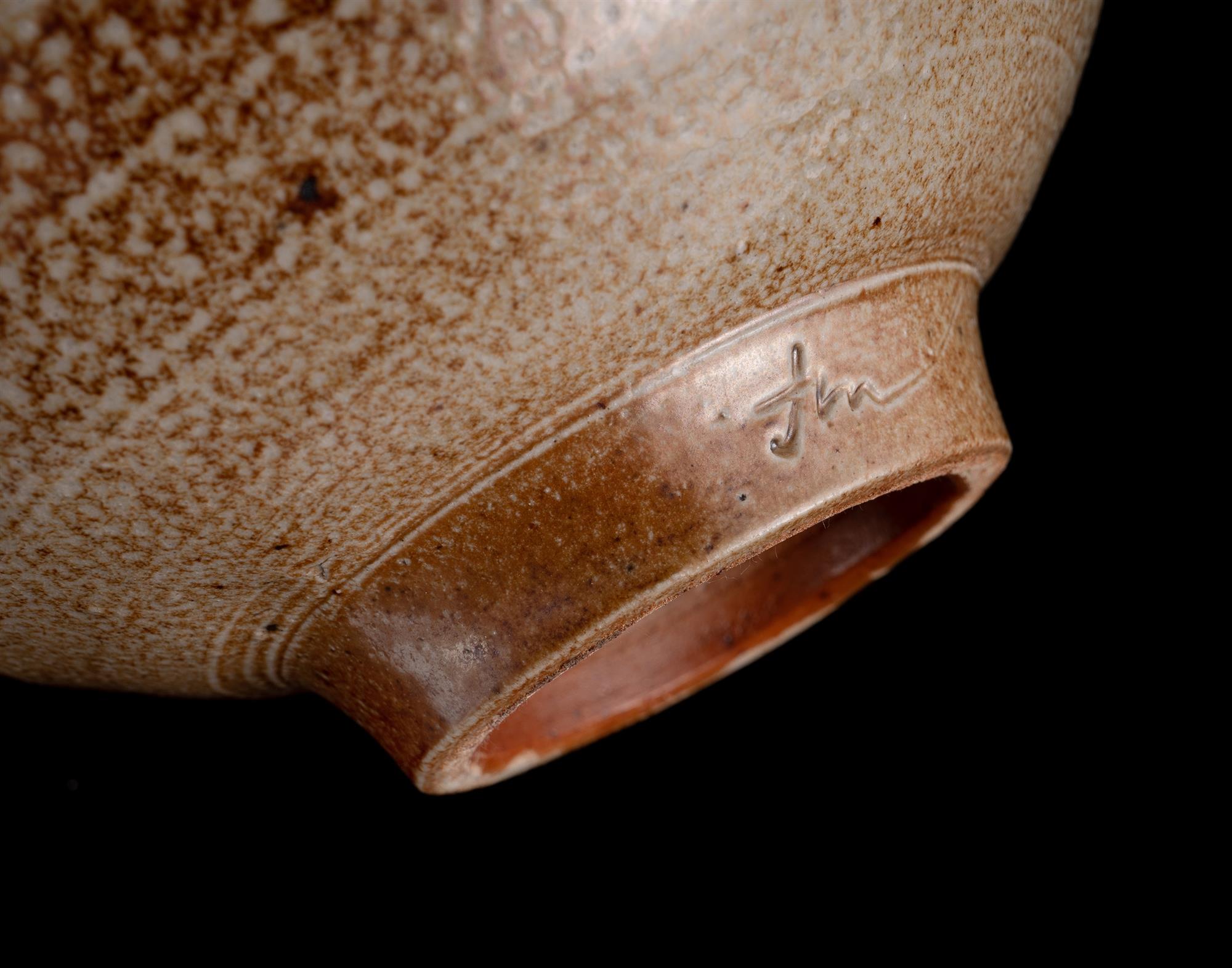 MANSFIELD, Janet (1934-2013), Salt glazed stoneware bowl. With applied handles. Raised on a circular foot. Incised initials to foot rim. (H11cm Dia 19cm)Estimate $200-300