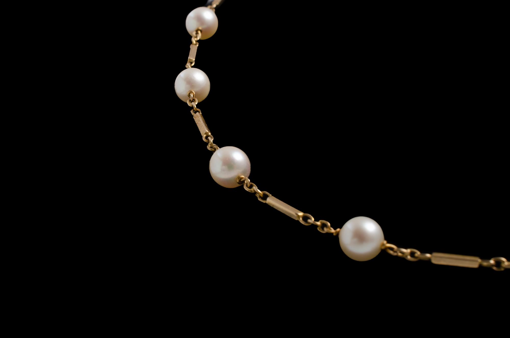 9ct Yellow Gold Pearl Necklace Sixteen 6 to 6.5mm cultured pearls on 9ct gold necklace. Total weight approx.10.2g (L44cm) Provenance: Deceased Estate, Sydney.Estimate $100-200