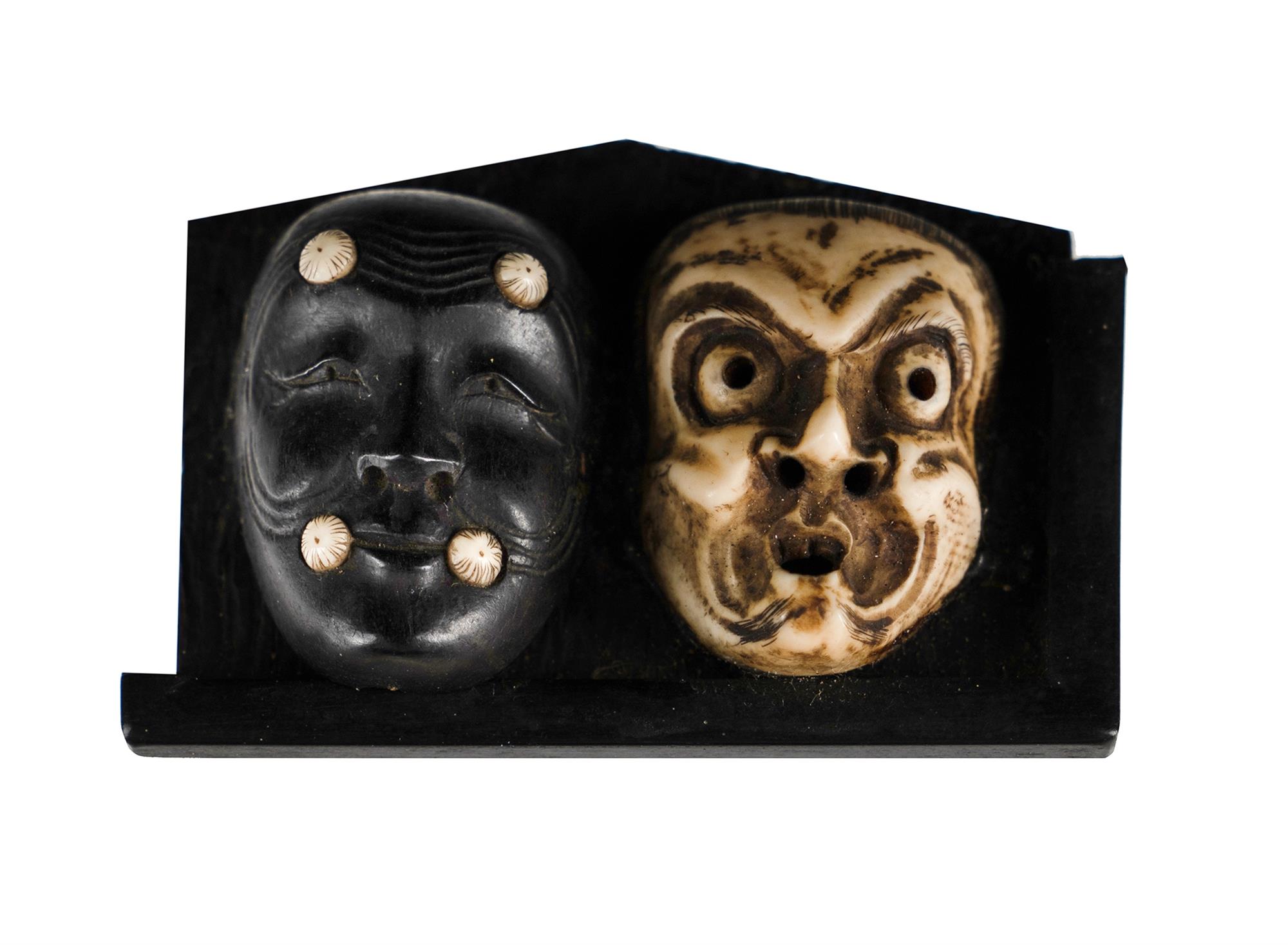 20th C Japanese Itobori Mask Netsuke 'Hannya' Saishiki style (H6cm). Together with a pair of miniature celluloid masks. (A/F)Estimate $100-200