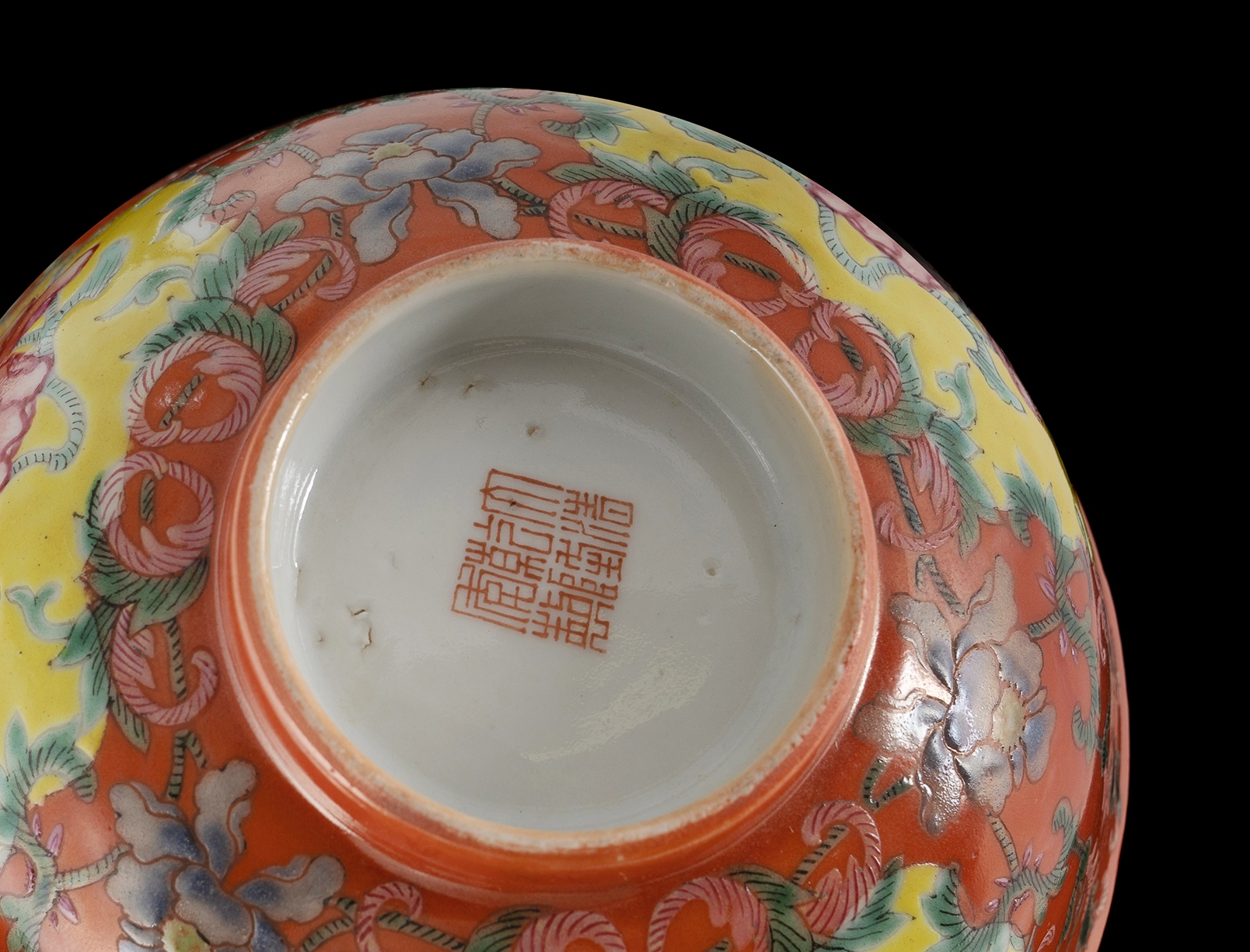 Pr Chinese Qing Dynasty Coral Ground Famille Rose Peony Bowls Qianlong six-character seal marks in overglaze red. D14cm (each) Estimate $400-800