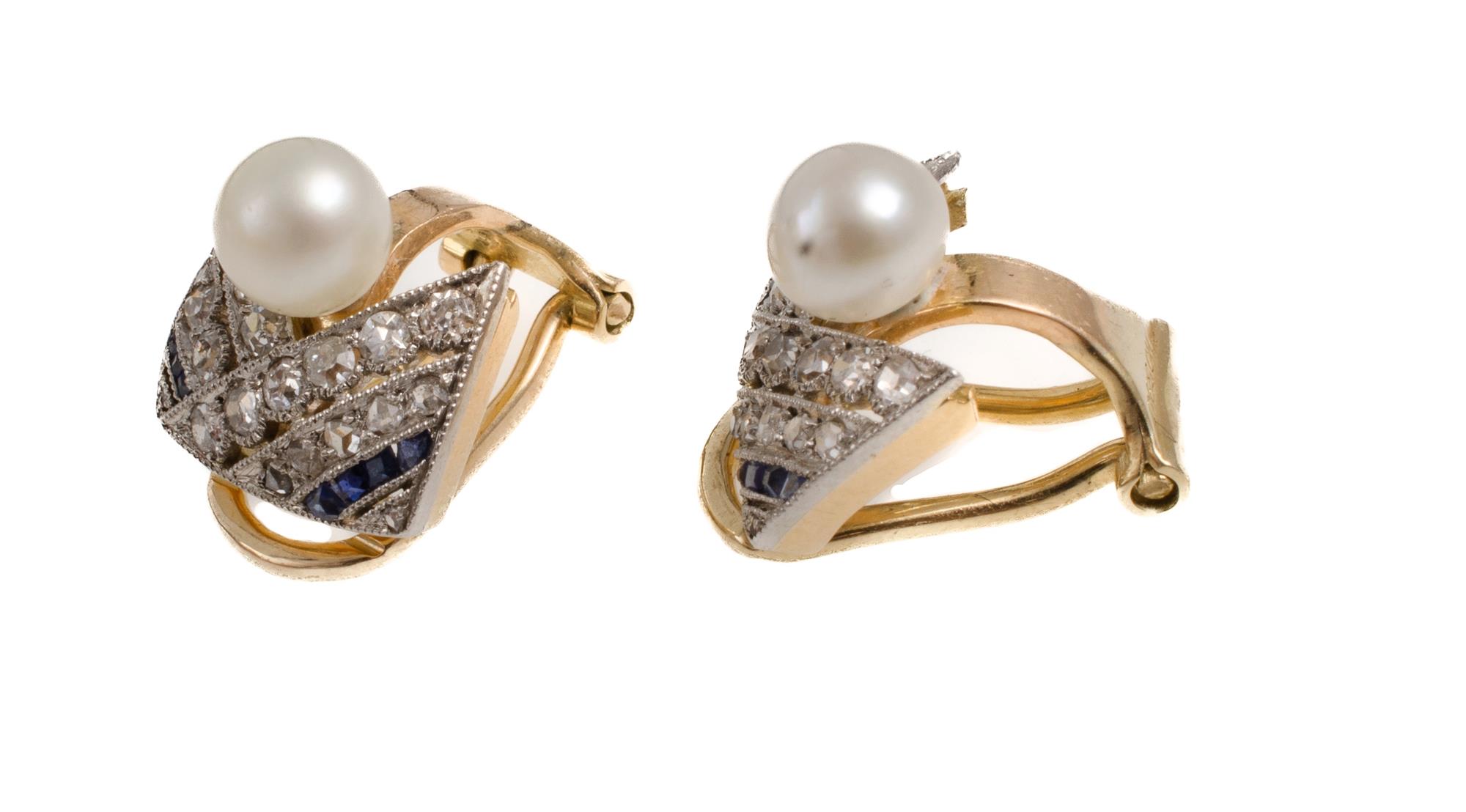 14ct Platinum, Diamond, Sapphire & Pearl Earrings Clip on earrings with 5.5mm pearls, early single cut diamonds & calibre cut sapphires. Sapphire weight around 0.05ct Diamond weight around 0.70ct Total weight approx. 5.05gEstimate $225-400