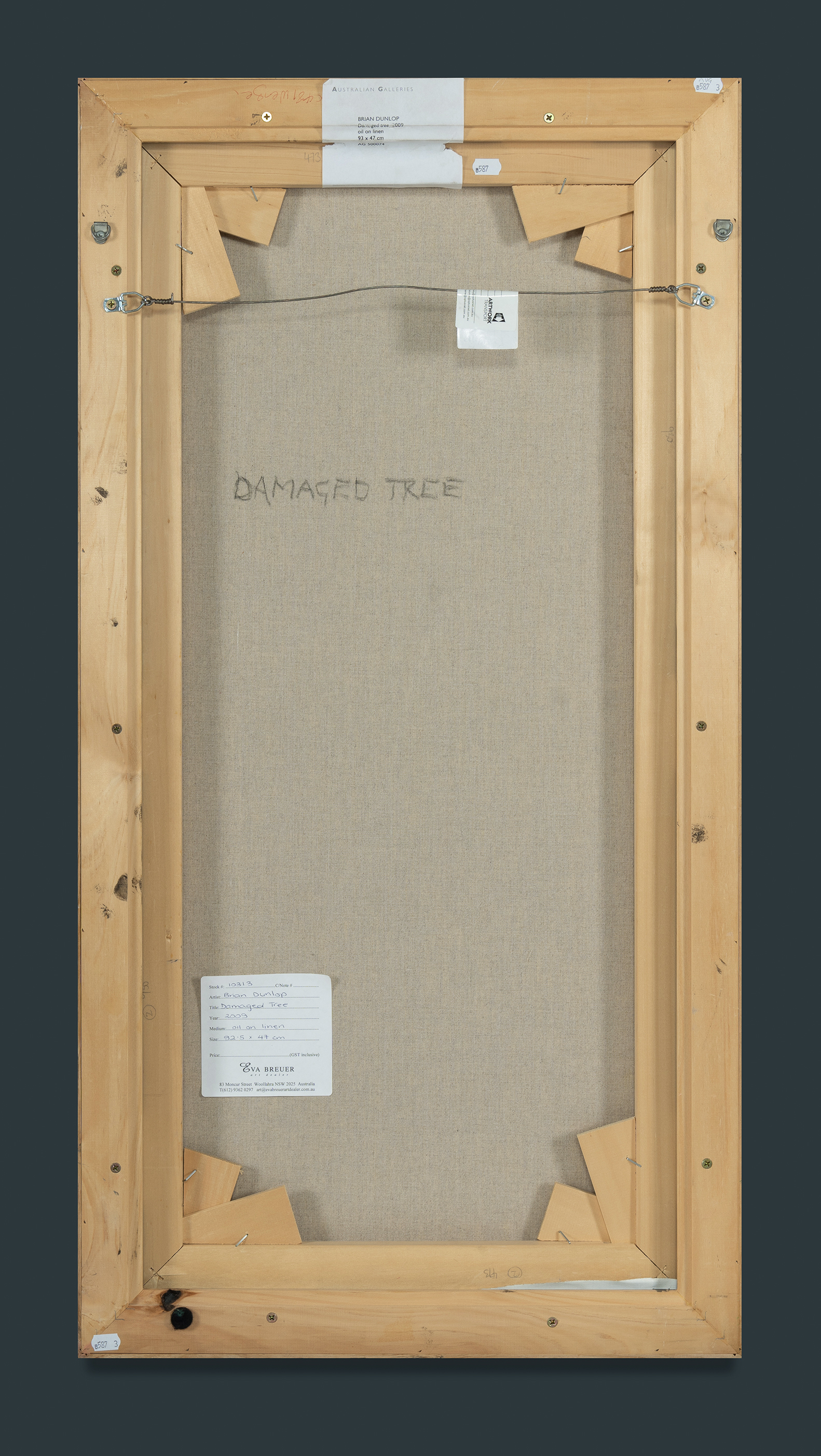 DUNLOP, Brian (1938-2009) 'Damaged Tree,' 2009. Titled verso. Gallery labels attached for Australian Galleries, Sydney, and Eva Breuer Sydney. Oil on Linen 93x47.5cmEstimate $1,800-3,500