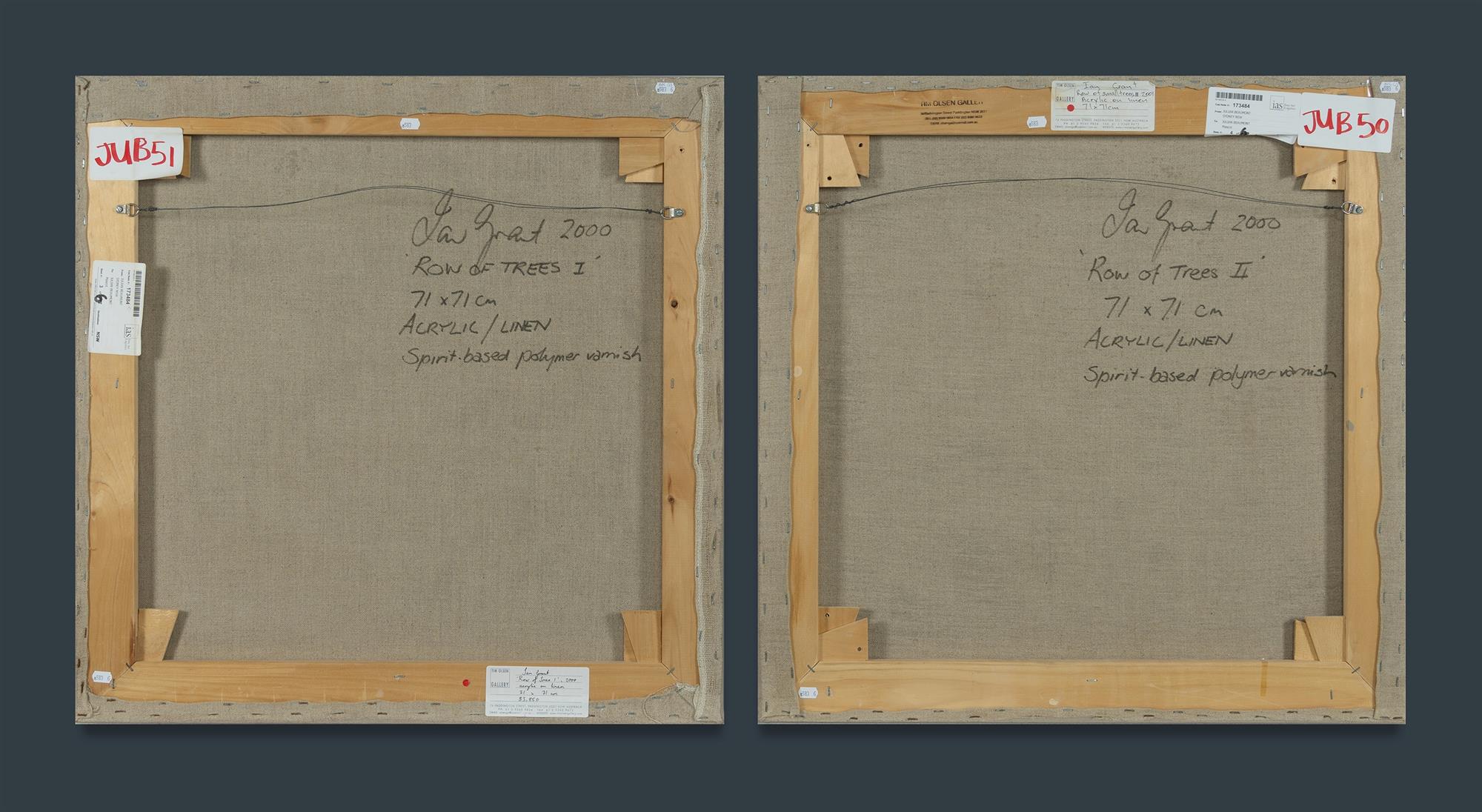 GRANT, Ian (b.1947) (2) 'Row of Trees I & II,' 2000. Both monogrammed, as well as signed and inscribed verso. Ex Tim Olsen Gallery - labels verso. Acrylic on Linen (2) 71x71cm (each)Estimate $700-1,200