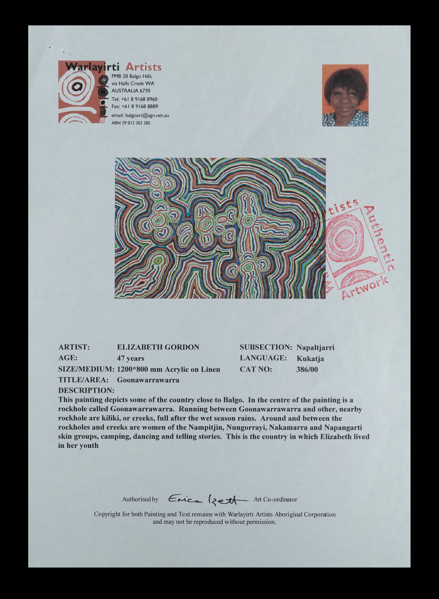 NAPALJARRI, Elizabeth Gordon (Aboriginal b.1954) 'Goonawarrawarra,' 2000. The work depicts the country close to Balgo, rockholes and creeks are full after wet season rains. Women are camping, dancing and telling stories. Acrylic on Linen 116x74.5cm PROVENANCE: Warlayirti Artists, cat #386/00 - certificate of authenticity available.Estimate $800-1,500