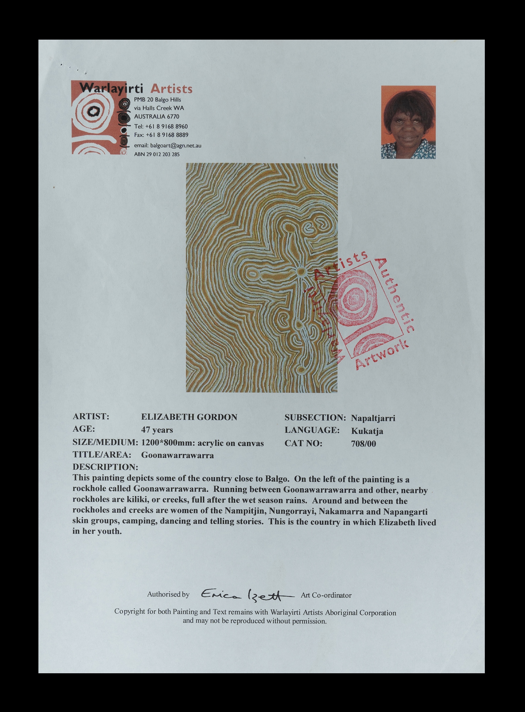 NAPALJARRI, Elizabeth Gordon (Aboriginal b.1954) 'Goonawarrawarra,' 2000. The work depicts the country close to Balgo, rockholes and creeks are full after wet season rains. Women are camping, dancing and telling stories. Acrylic on Canvas 118x79.5cm PROVENANCE: Warlayirti Artists, cat #708/00 - certificate of authenticity available.Estimate $800-1,500