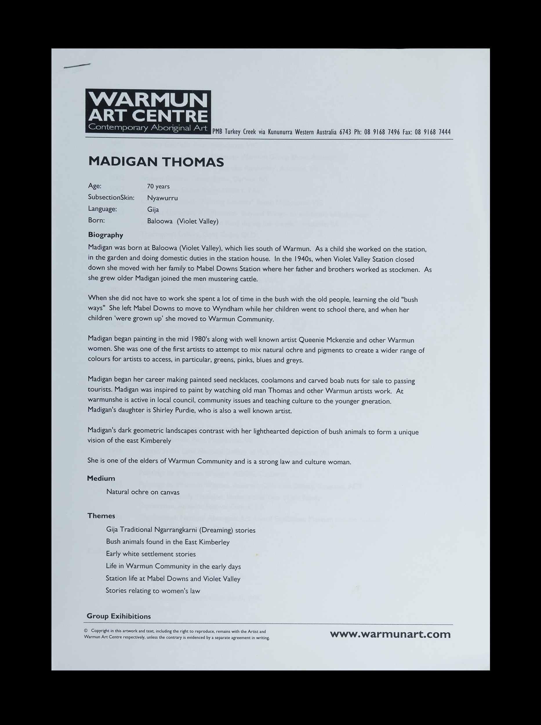 THOMAS, Madigan (Aboriginal born c.1935) 'Jallangngenung,' 2000. Natural Ochres on Canvas 120x90cm PROVENANCE: Warmun Art Centre cat #WAC398/00.Estimate $1,000-2,000