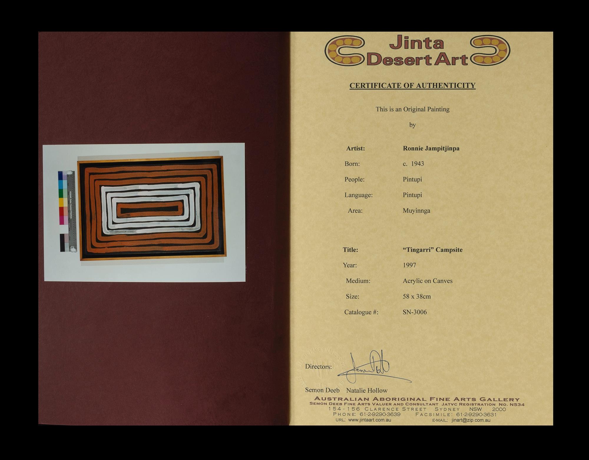 TJAMPITJINPA, Ronnie (Aboriginal born c.1943) Tingarri Campsite,' 1997. Acrylic on Canvas 58x38cm PROVENANCE: Jinta Desert Art, cat #SN-3006 - certificate of authenticity available.Estimate $600-1,000